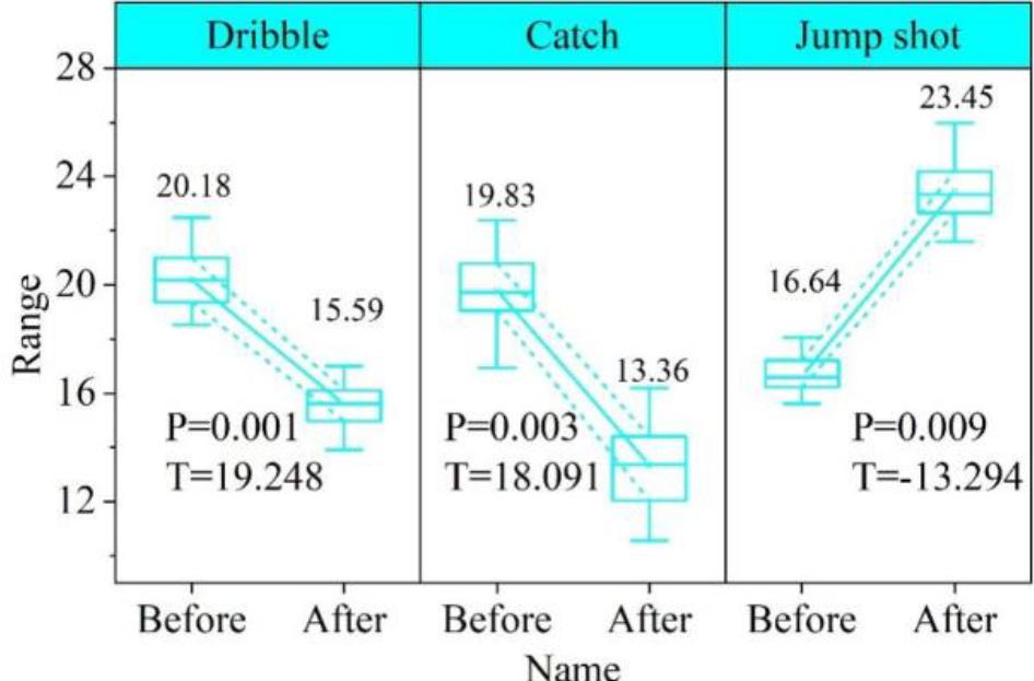 The results of the comparison of test scores before and after the experiment in the control group are shown in Figure 5. The control group adopts the conventional sports skills teaching method. Students learn basketball skills mainly through the teacher’s intuitive demonstration; in the process of learning more imitation of the teacher’s technical movements, the principle of technical movements is not very clear, so the students don’t know whether their technical movements are correct in the process of practicing, and the problems that arise in practice can only be solved by the teacher’s tour guidance. Problems that arise during practice can only be solved under the teacher’s touring guidance. Due to the limited teaching time, coupled with a large number of people, it is not easy to complete the content of the class to ensure quality and quantity. If the teacher instructs everyone to master the content of what they have learned, it is difficult to complete the task and the content of the class. If we want to cover the entire content of this lesson, we cannot instruct everyone, and some students may not be able to master the technical movements properly. Because of the differences in the basic level and receptive ability of each student, the students with good foundation and strong receptive ability can master the technical movements learned faster and better in the process of learning, while the students with poor foundation and poor receptive ability can not master the content learned well. In the use of conventional physical education skills teaching method in the control group of the technical indicators by paired samples t-test found that the effect of dribbling technology is not significant (T = 2.328, P>0.05), the effect of shooting in place technology is not significant (T = 2.431, P>0.05), and the effect of two-person marching passes shooting technology is not significant (T = 3.062, P>0.05). It shows that the use of conventional physical education teaching methods has some improvement on the students’ basketball skill level, but the improvement is not significant.