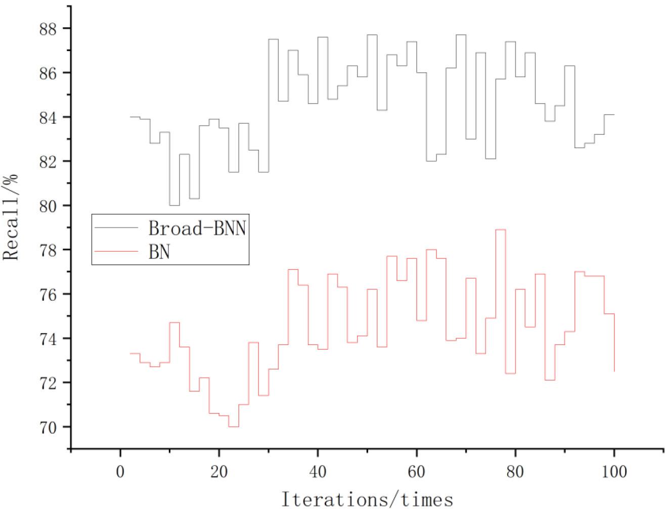 Figure 5 intuitively reveals the comparison of recall rates between the Broad-BNN model developed in this paper and the traditional BN model in high-dimensional data classification tasks. Recall rate, as one of the important indicators for evaluating the performance of classification models, refers to the proportion of positive cases correctly predicted by the model among all positive cases. By carefully observing the chart, we can clearly see that compared to the traditional BN model, the Broad-BNN model proposed in this paper exhibits superior performance in terms of recall rate. This significant increase in recall not only validates the high accuracy of our model in classification tasks, but also further highlights its strong generalization ability when dealing with high-dimensional data. It is worth noting that this article cleverly combines width learning theory and BN in model design. This innovative fusion strategy not only improves the classification accuracy of the model, but also significantly enhances its adaptability in complex data environments.