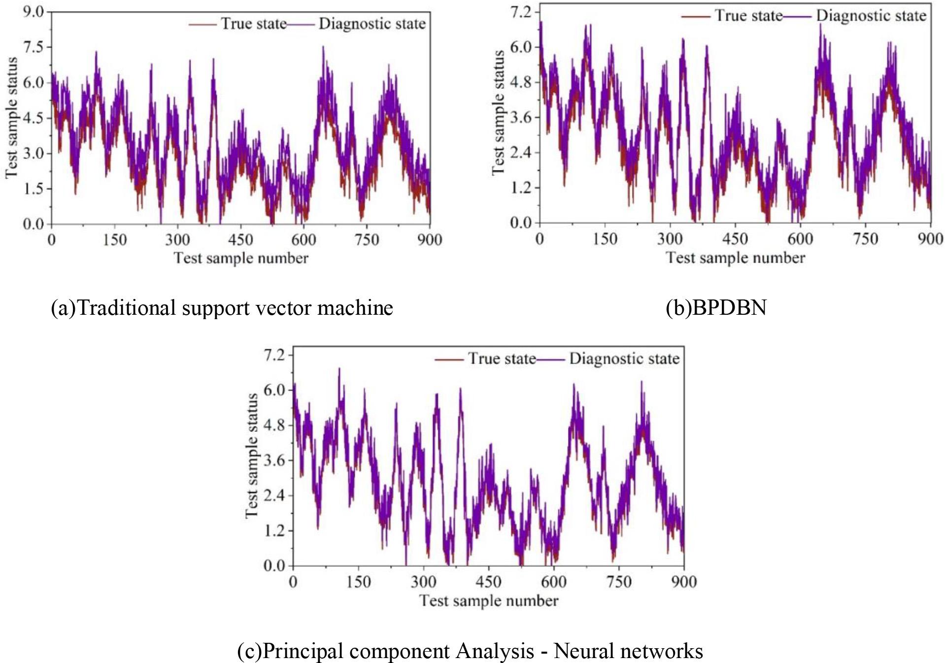 The feature vectors of the obtained test sample set are input into the traditional support vector machine, BPDBN diagnostic model and master element analysis-neural network diagnostic model for diagnostic experiments, respectively. The test results of the high-speed zone transmission mechanism fault diagnosis model are shown in Fig. 5, where (a) ~ (c) are support vector machine, BPDBN, and principal element analysis-neural network, respectively.