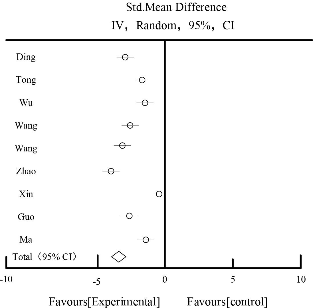 Table 6 and Figure 6 show the results of the effect of glycated hemoglobin. A total of 9 studies described glycated hemoglobin, a total of 1,070 patients were included,535 patients in each of the control and experimental groups. The combined results showed that: there was a high degree of heterogeneity among the studies(I2=98.56%). After sensitivity analysis by excluding each study one by one and different subgroups of the studies targeting the intervention period, drug dosage form and the diagnostic profile. The random effect model was chosen, the diamond was located on the side favoring the experimental group, MD=-0.69, 95%CI [-1.29, -0.29], Z=3.25, P=0.00005, and the difference was statistically significant, indicating that the experimental group was better than the control group in improving glycated hemoglobin.