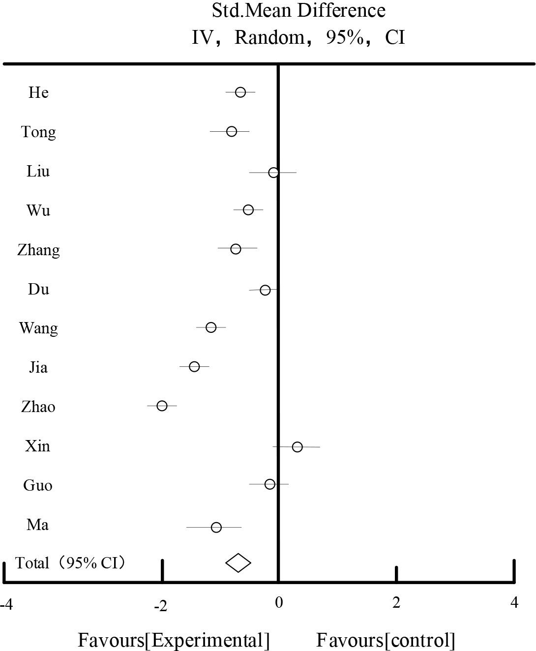 Table 4 and Figure 4 showed the results of the effect of FBG, 12 studies reported FBG, 709 patients in the test group and 704 patients in the control group, the results of the heterogeneity test showed that: I2=96.23%, suggesting that there was a large heterogeneity between the studies, and according to the P<0.00001, I2=96.23%>50%, so a random-effects model was chosen for the analysis. The results of the Meta-analysis showed that: the rhombus located on the side favoring the experimental group, MD=-0.79, 95%CI [-1.08,-0.39], P<0.0001, the difference was statistically significant, indicating that the experimental group was better than the control group in improving FBG in diabetic nephropathy.
