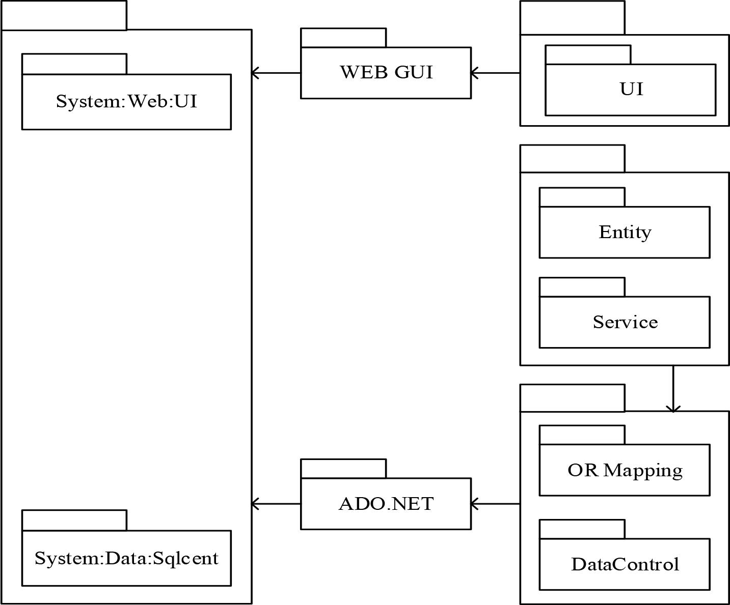 As shown in Figure 1, the system is divided into three layers: presentation layer, business logic layer, and data layer. The performance layer uses the business logic layer, and the business logic layer uses the data layer. The performance layer mainly includes the UI display class to display the interface. The business logic layer includes the entity class and service class, while the data layer includes the mapping class and data control class. The business layer depends on the WEB GUI to show that the data layer relies on ADO.NET technology. The three-tier structure is built on the basis of the .net framework.