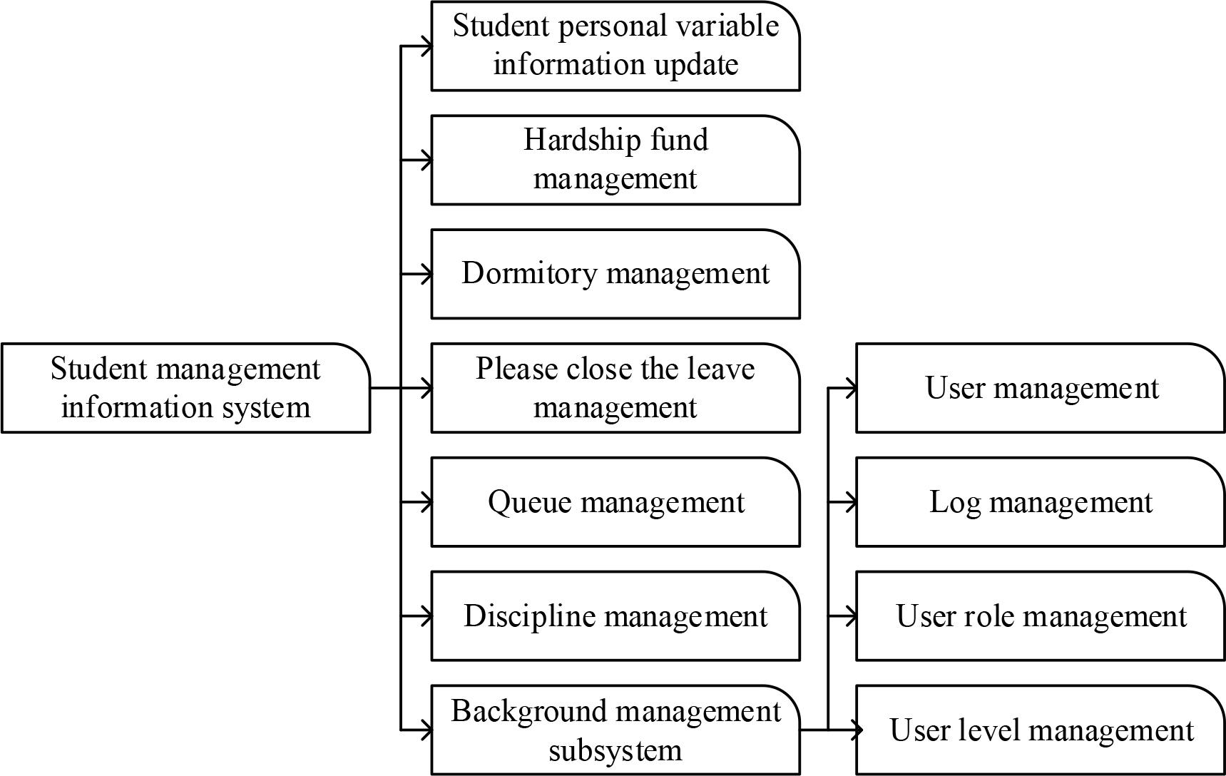 The functional architecture design defines the relationship between the main parts and components of the software system. As shown in Figure 2, the system consists of six modules and one sub-system, which are: student variable information management module, difficult student financial aid management module, dormitory management module, leave management module, queue management module and discipline management module. This subsystem is the background management subsystem, which is divided into four modules: user management, log management, system role management, and user level management.