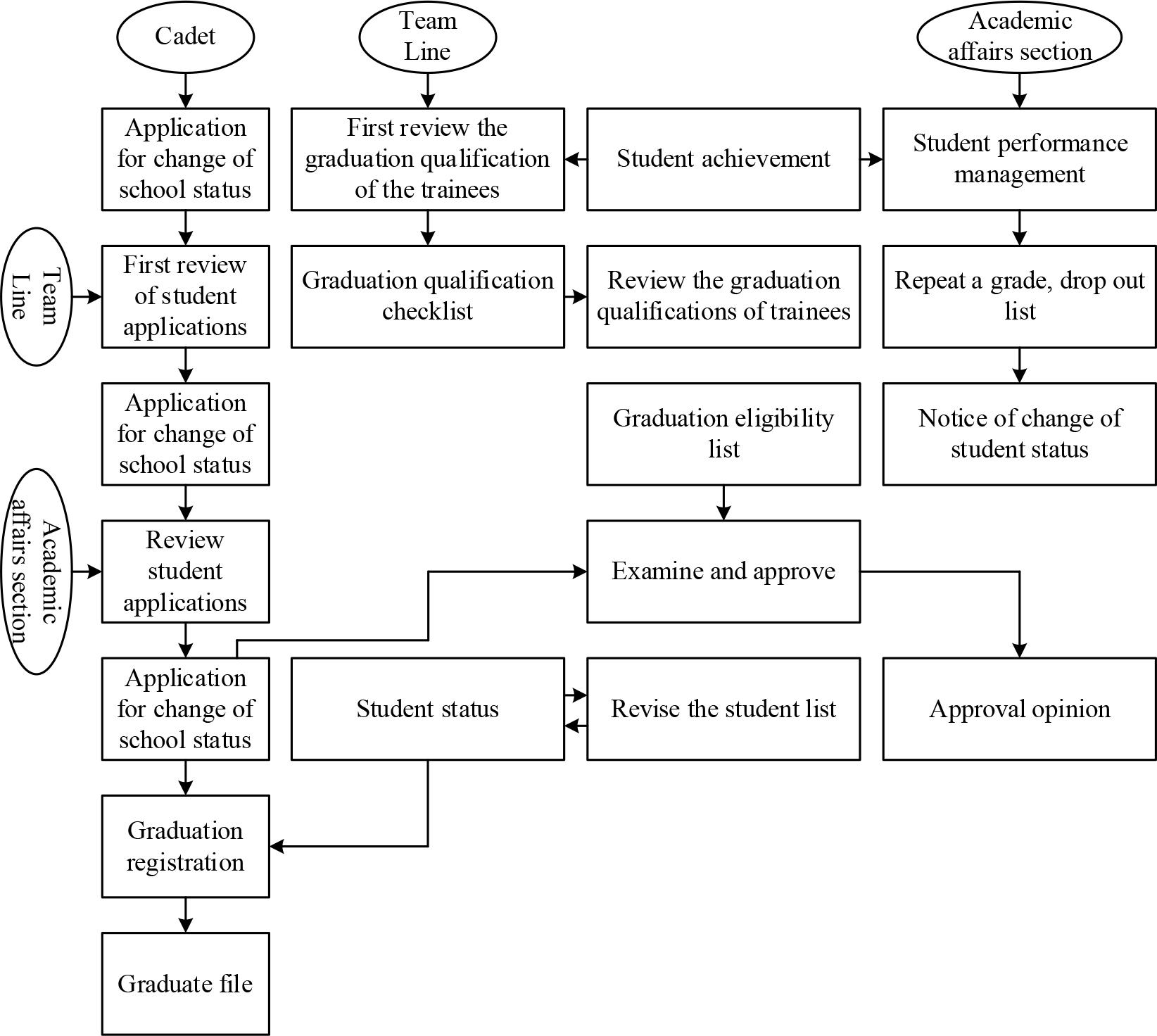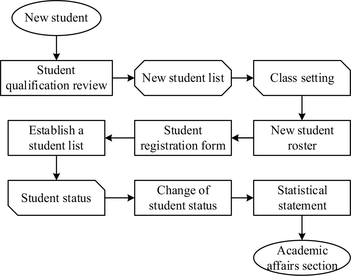 The basic information management business process mainly includes the registration of new trainees, the division of classes or teams, and the establishment of trainee registration, etc. This business process is based on the analysis of the basic needs of trainee information management and the process formulated with the management personnel of the Academic Affairs Section of the university, and the business process has added a lot of new processing operations, which are described as follows.