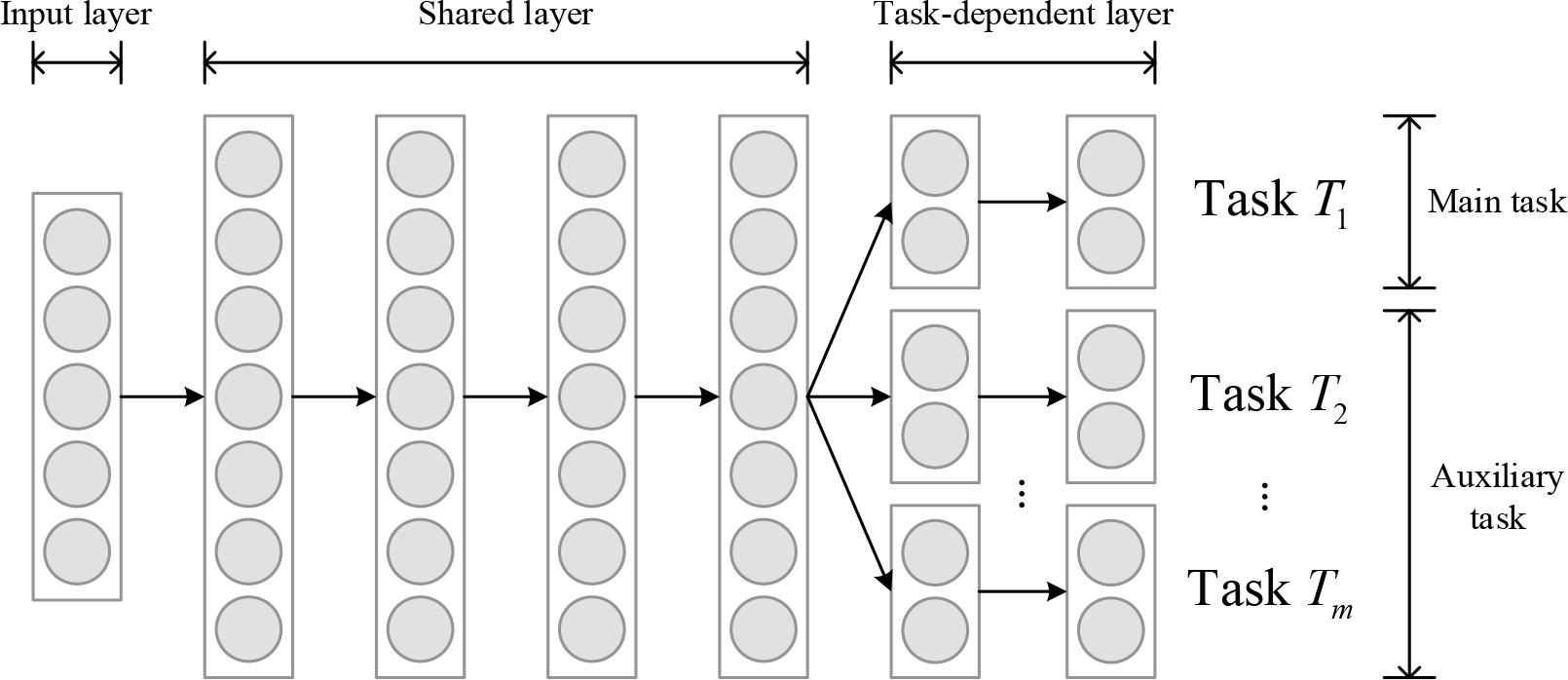 It can be seen that the hidden layers of the network are shared by multiple tasks, while the task-related layers perform different task learning. Sharing several hidden layers at the bottom of the network, different tasks learn common low-level features from labeled samples related to different tasks, which can effectively utilize the labeled sample information and also reduce the risk of data overfitting. It should be emphasized that in this learning paradigm, auxiliary tasks can help improve the learning performance of the main task, i.e: