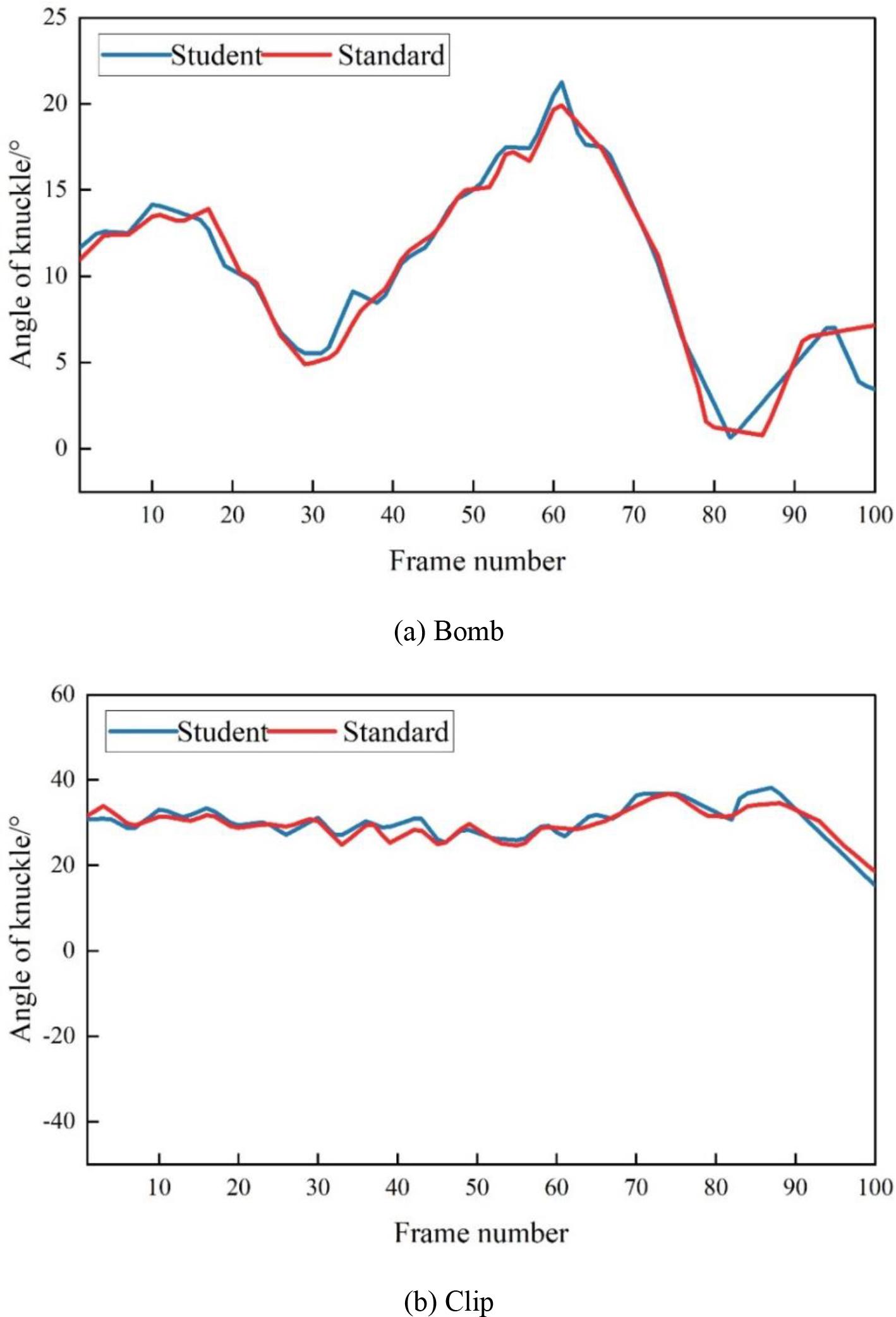 Comparison of knuckle angles during performance with the standard angles is shown in Figure 3. (a)~(c) are the changes of the knuckle angle for the movements of “lifting”, “pinching” and “shaking”, respectively. As can be seen from Fig. 3, the overall trend of the changes in the angle of the knuckle is more consistent with that of the standard angle during the student’s performance. The average errors of “lifting”, “pinching” and “shaking” with the standard angle were 0.402, 0.437 and 1.244 respectively, while the average error of “shaking” was the largest. During the playing of “finger shaking”, the error between the angle of the knuckle and the standard angle was the largest, which may be due to the fast change of movement and large movement amplitude of this fingering, which makes it more difficult to play compared with the other two fingering methods. The student’s changes in the angle of the knuckles in the basic playing technique were cnt’s joint mobility was more flexible.