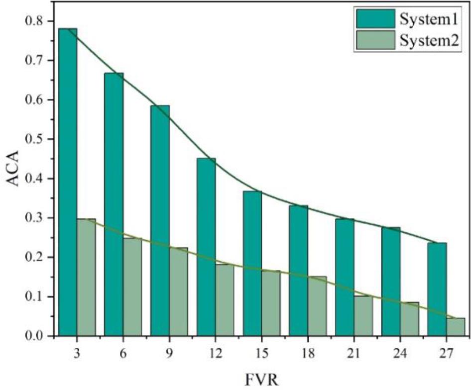 In this subsection, we will explore the change of privacy protection effect between the initial smart home system and the new smart home system, applying the techniques in this paper as the amount of noise data increases, i.e., the FVR value grows. The density plot of the privacy protection effect is specifically shown in Fig. 3, where System1 and System2 represent the initial smart home system and the new smart home system, respectively. It can be seen that with the growth of the FVR value, both the initial smart home system and the new smart home system, the privacy protection effect is gradually enhanced, i.e., the ACA value shows a stable decreasing trend, but the latter privacy protection effect, i.e., the ACA value, decreases more and is closer to 0. When the FVR value reaches 27, the ACA value of the initial smart home system is 0.236, while the ACA value of When the FVR value reaches 27, the ACA value of the initial smart home system is 0.236, while the ACA value of the new smart home system applying this paper’s technology is only 0.045, which is 0.191 less than that of the initial smart home system. Compared to the initial smart home system, the new smart home system using this paper’s privacy-protecting technology achieves a better privacy-protecting effect.