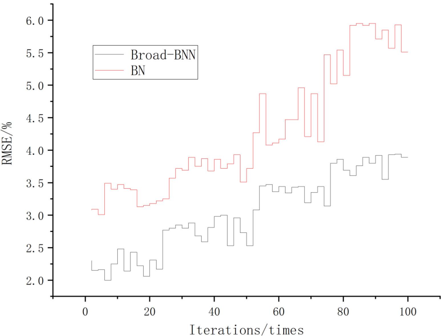 Figure 7 visually illustrates the comparison of root mean square error (RMSE) between the Broad-BNN model developed in this paper and the traditional BN model in high-dimensional data classification tasks. RMSE is an important statistical measure that measures the difference between a model's predicted value and its true value. The lower its value, the higher the model's prediction accuracy. By carefully observing the chart, we can clearly see that compared to the traditional BN model, the Broad-BNN model proposed in this paper exhibits superior performance in terms of RMSE, with a lower RMSE value. This significant reduction in RMSE not only validates the high-precision prediction ability of our model in classification tasks, but also further highlights its excellent stability and robustness in handling high-dimensional data. This article innovatively integrates the theory of width learning and BN in model design. This strategy not only improves the prediction accuracy of the model, but also achieves a significant reduction in RMSE through the complementary advantages of the two.