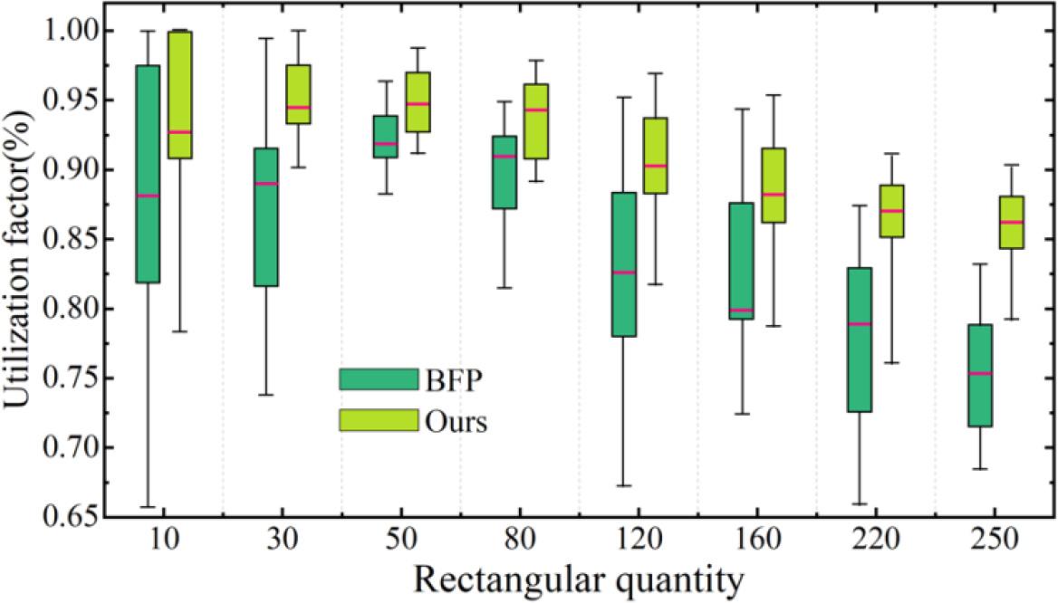 In this paper, a constructive heuristic algorithm (BFP) is chosen as the comparison algorithm. Both algorithms have the same parameter settings, and the algorithm implementations are implemented on the same machine configuration using Python language.On the constructed perfect dataset, 100 tests are performed on different numbers of instances with different numbers of rectangles, and both algorithms are evaluated by strip utilisation and running time. The results are shown in Table 1; the best results are highlighted in bold, and the average performance of all the instances is given in the last row. Figure 4 shows the utilization box-and-line plots for the two algorithms.