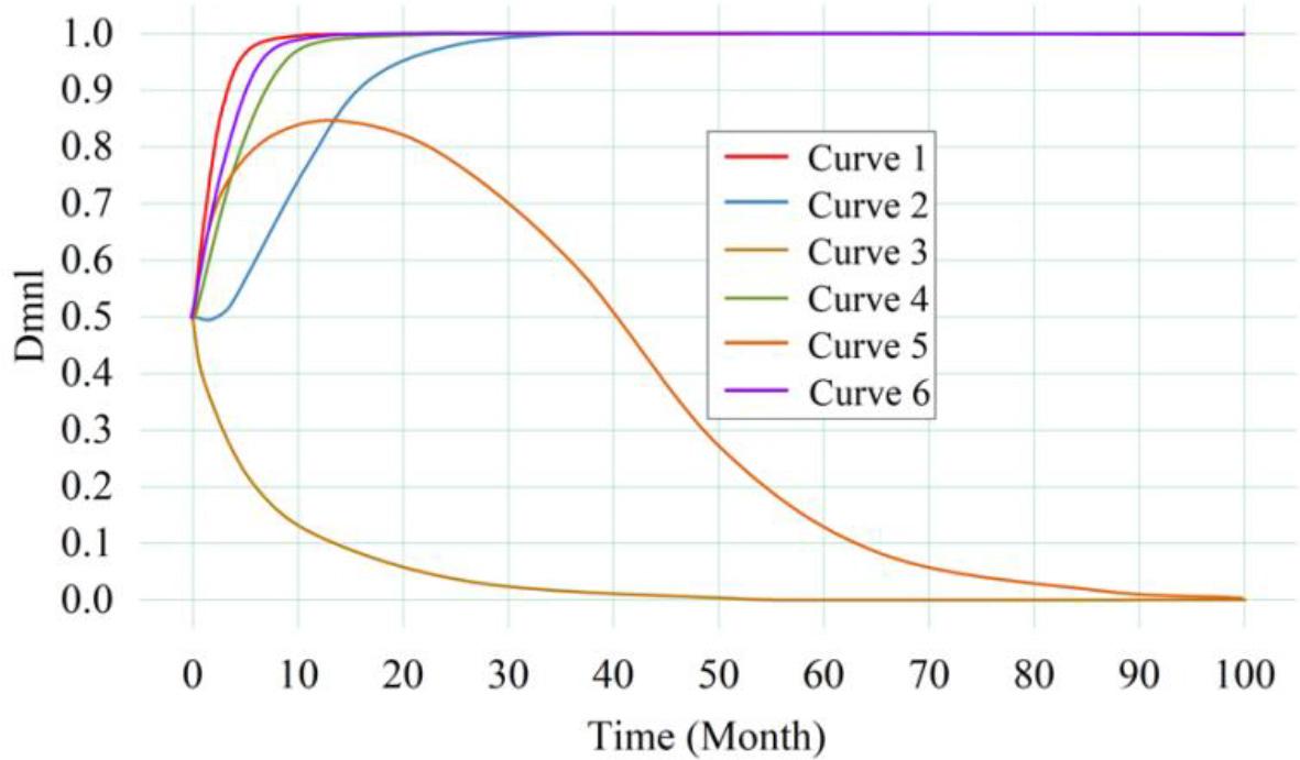 In the case of green marketing by enterprises, public participation in monitoring can obtain certain benefits. The simulation results of the expected gain of public participation in supervision on the influence of public strategy are shown in Fig. 10, which shows that when the exogenous variable takes the initial value, the public, whether it is mutated from 0 or 1, will eventually reach a stable equilibrium, i.e., participation in supervision, in 1. Among them, curve 5 is the initial value of the public participation in monitoring the expected benefits of 1. When the initial value is increased from 1 to 1.1 and 1.2, the trend of the public strategy change corresponds to curve 2 and curve 1, respectively, and it can be seen that the greater the benefits, the steeper the curve, the sooner it reaches a stable equilibrium at 1. When the initial value decreases from 1 to 0.9 and 0.8, the curves corresponding to the public strategy change are curve 3 and curve 4, respectively, and it can be seen that the smaller the gain, the lower the public’s initiative to monitor, and the longer the evolution to the stable equilibrium point 1. Therefore, the benefits received by the public are also an important factor influencing the level of their willingness to monitor.