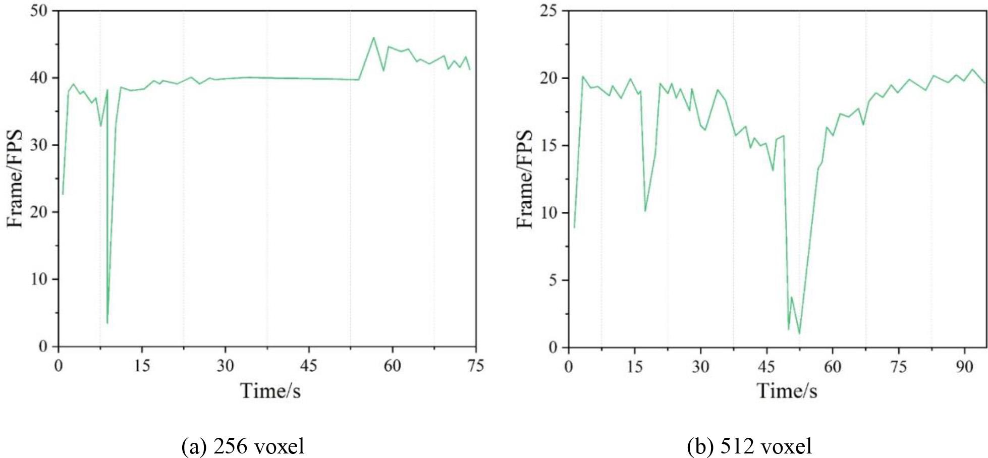 Figure (b) shows the variation of frame rate for 512 resolution voxels, and it can be seen that the frame rate decreased significantly compared to the 256 resolution experiment, basically between 15 and 20. And the roughness was similarly adjusted from 50s onwards.