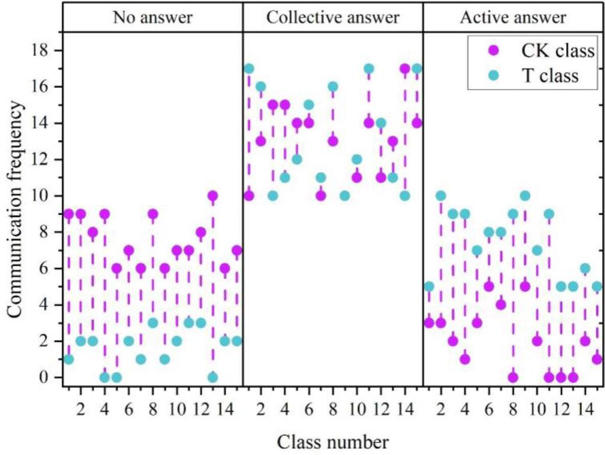 Facets of teacher-student communication Across 15 randomly selected lessons in both the control and experimental classes, we counted the number of collective and individual student responses to questions. The statistical outcomes reflecting teacher-student communication in the classroom are presented in Figure 4. According to the data in the figure, it can be seen that the average number of unanswered questions in the control class is 7.6 and the average number of unanswered questions in the experimental class is 1.6, and the average number of unanswered questions in the experimental class is lower than that in the control class. The average number of collective responses to questions in both classes was around 13. In addition, the average number of times students volunteered to answer questions was 2.1 in the control class and 7.5 in the experimental class, highlighting a higher level of engagement in the experimental class. From this, it is clear that the The experimental class demonstrated superior classroom dynamics and teacher-student communication compared to the control class, as evidenced by the facets of communication frequency, engagement, and skill development. Manner and degree of teacher-student communication In 15 randomly selected lessons in the control and experimental classes, the quality of students’ responses and the teacher’s way of answering questions were counted, and Table 5 depicts the results of the manner and degree of teacher-student communication in the classroom. As can be seen from the table, the p-value for the extent of students’ answers to the questions posed by the teacher is 0.000 for the control and experimental classes in terms of unresolvable, tentative and comprehensible statements, i.e., there is a highly significant difference between the two classes. To some extent, the quality of students’ answers influences the teacher’s reasoning approach. The mean number of repetitive teacher responses in the experimental class was lower than that of the control class with P=0.000, i.e., there was a highly significant difference in the repetitive teacher responses in the control and experimental classes. In the experimental class, the average number of teachers’ encouraging comments or follow-up questions was 13.21, higher than that in the control class. The non-response of teachers in both the control and experimental classes showed no significant difference, suggesting that teachers in the experimental class employed a more effective response method. Therefore, it is evident that the classroom effect in the experimental class surpasses that of the control class, particularly in terms of the manner and extent of teacher-student communication.