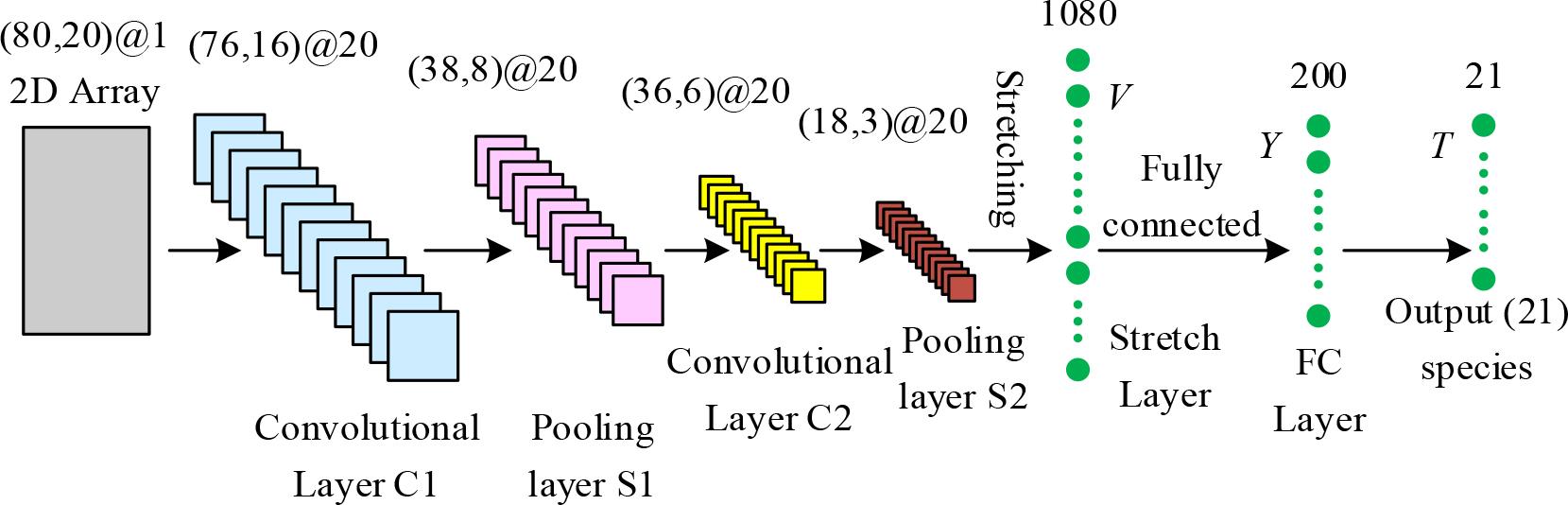 The structure of the convolutional neural network is shown in Fig. 1. The convolutional neural network is a typical deep learning model, which learns each local feature in the input through the convolutional kernel and extracts the deep abstract feature information layer by layer, and then fuses and analyzes each local information through the fully connected layer. When a two-phase ground fault occurs on line Convolutional layer: the size of the corresponding convolutional kernel for C1 is 5×5 and for C2 is 3×3. The number of convolutional kernels for both C1 and C2 is 20, and the step size is 1. The ReLu function is used as the activation function. Pooling layer: both S1 and S2 are pooled using maximum pooling, and the size of the corresponding maximum pooling window is 2 × 2 with a step size of 2. Fully connected layer FC layer: the number of neurons in the FC layer is 200, and the ReLu function is used as the activation function. Softmax layer: the output of the Softmax layer has 21 classes and uses one-hot coding. The cross-entropy function is used as a loss function to measure the difference between the classification result of the input array and the desired support output.