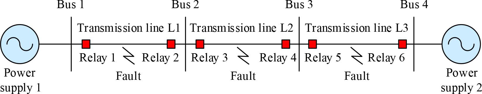 Line 2 is analyzed using data collected from Relay3 and Relay4. For the protection of Line 2, faults occurring on Line 1 and Line 3 are external faults, and faults occurring on Line 2 are internal faults, and internal and external faults on the line are each categorized into 10 specific fault types including single-phase grounded short-circuits, two-phase short-circuits, two-phase grounded short-circuits, and three-phase grounded short-circuits (three-phase short-circuits and three-phase grounds are considered to be the same type of fault). Thus, including no faults, Line 2 can be categorized into a total of 21 status categories.