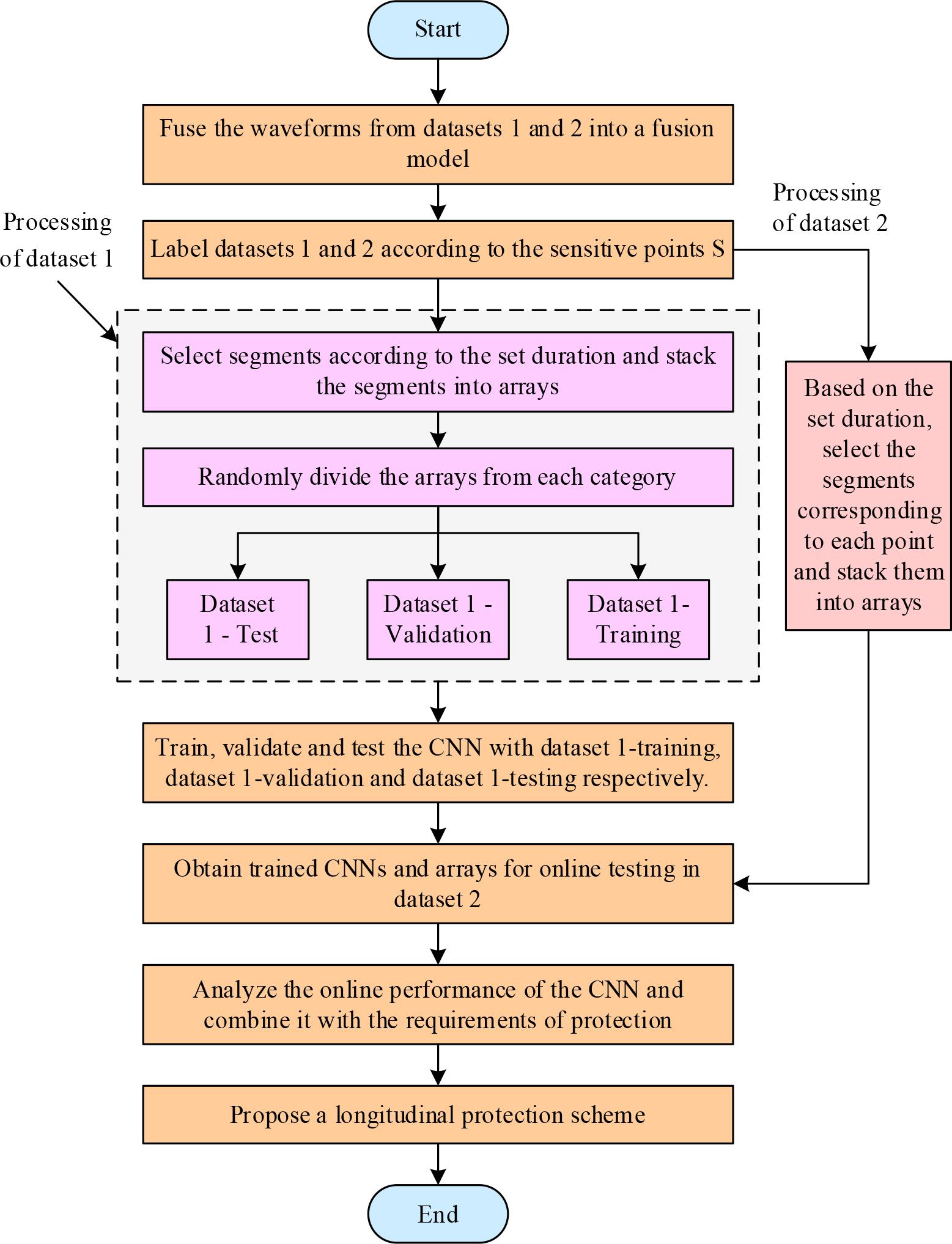 After online testing, the flow of the proposed corresponding power system protection scheme is shown in Fig. 3, considering the online performance characteristics of the recognition algorithm. The three subsets are named as dataset 1-training, dataset 1-validation, and dataset 1-testing, respectively. The network with the highest accuracy in dataset 1-validation is selected as chosen as the final CNN, and dataset 1-test is used to test the performance of the CNN. In order to validate the generalization ability and online performance of the CNN after evaluating the training completion, the online test is performed with dataset 2. Setting the duration as half a week wave, at a sampling frequency of 10kHz, after the fusion model configuration in dataset 2, the corresponding segments are selected at each fusion data point, each segment is 100 points in length for online testing of the trained CNN, and these segments obtained are also directly referred to as the segments in dataset 2. The protection scheme consists of a fault initiation determination scheme and a fault type discrimination scheme, and the two sub-schemes in the power system protection scheme will be subsequently validated and analyzed. When an internal fault is recognized, the protection is initiated first, and after 1/4 cycle, if the same fault type is detected at c consecutive points, a trip instruction A is sent to the processor, and in the next small period of time, for example, 1/8 cycle of time, the processor compares the instruction A with the trip instruction B obtained from the existing protection scheme, and the protection is tripped if the trip instruction B is a trip signal. If the signal B has been a non-trip signal, the decision of whether to trip is made according to the importance of the protection for security and dependability in different scenarios, for example, in scenarios with high security, the protection is not tripped on the basis of the instruction B. In scenarios with high dependability requirements, the protection is tripped on the basis of the tripping instruction A from the CNN.