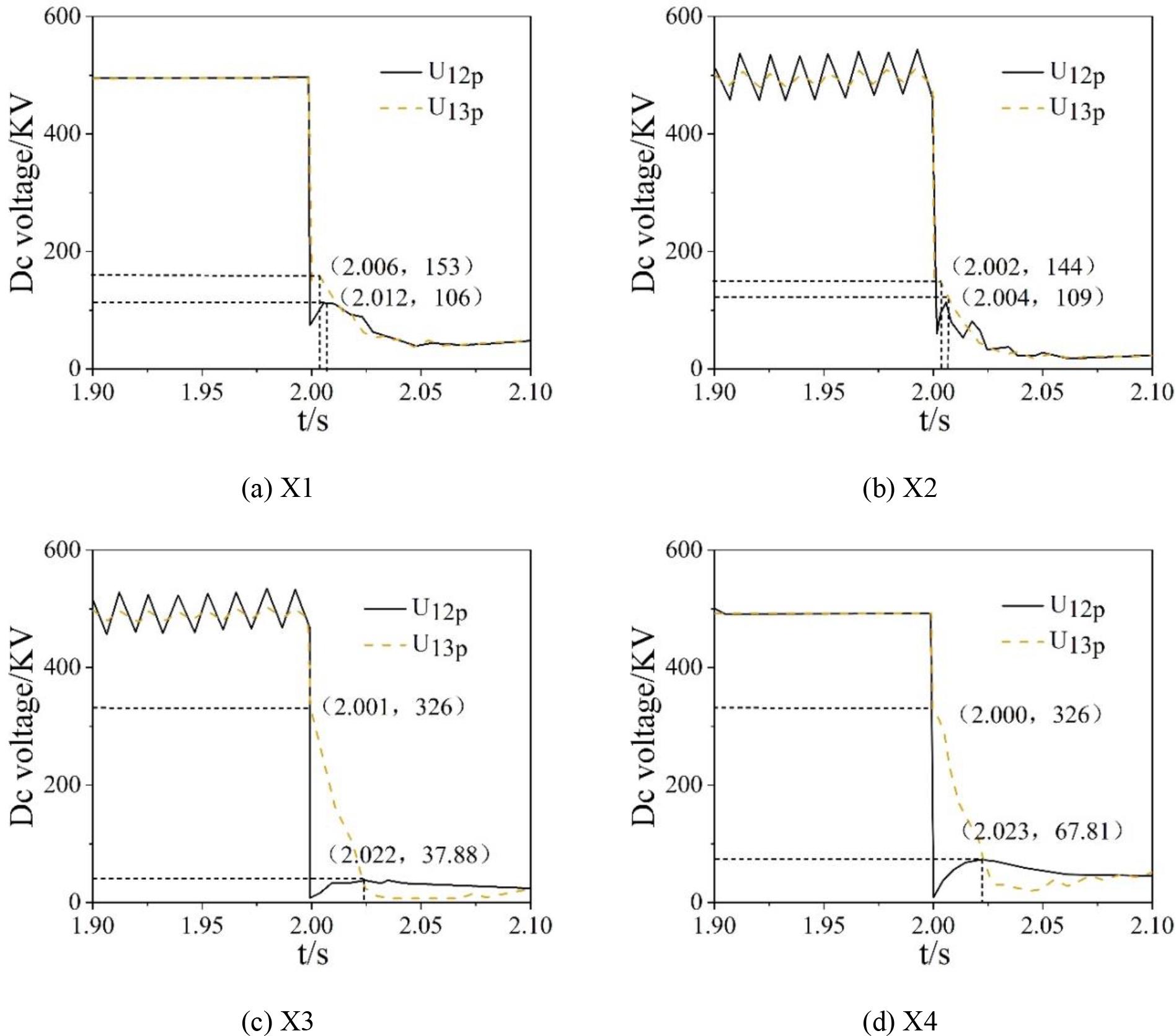 Simulation analysis of fault initiation determination scheme When the power system is running, CNN detects the positive DC voltages Simulation analysis of fault type determination scheme To determine the fault type, CNN is firstly required to confirm the determination threshold Impact of fault resistance on fault type determination thresholds In order to determine whether the fault resistance Influence of flat wave reactor on the threshold value of fault type determination In order to determine whether the flat-wave reactor Simulation analysis of the overall process of the protection program Real-time acquisition of each line voltage and current parameter, the whole process of power system fault protection resection is shown in Fig. 9, where (a) ~ (d) are bus-side inter-pole short-circuit fault, bus-side single-pole ground fault, line-side single-pole ground fault, and line-side inter-pole short-circuit fault, respectively. When the CNN detects a power system fault at 2s, the line voltage drops instantaneously, producing a voltage instantaneous drop value exceeding the fault initiation threshold, and the fault discrimination scheme is initiated. At this time, the fault has collected the current of each line, and input the signal into the correlation coefficient analysis module added in the relay protection device to identify the fault area through analysis. At the same time of fault area identification, the signal will be input into the current difference module in the relay protection device, and the fault type will be determined by analyzing the current difference, and the whole process can be completed within 20ms, which meets the quick-action nature of relay protection. Therefore, the CNN detects the power system after the fault occurs 20ms, and sends a command to act on the HVDC circuit breaker to complete the fault removal. In the case of different areas and different fault types, the high-voltage DC circuit breaker can correctly remove the fault after the fault determination scheme, which confirms the feasibility of the power system protection scheme in this paper.