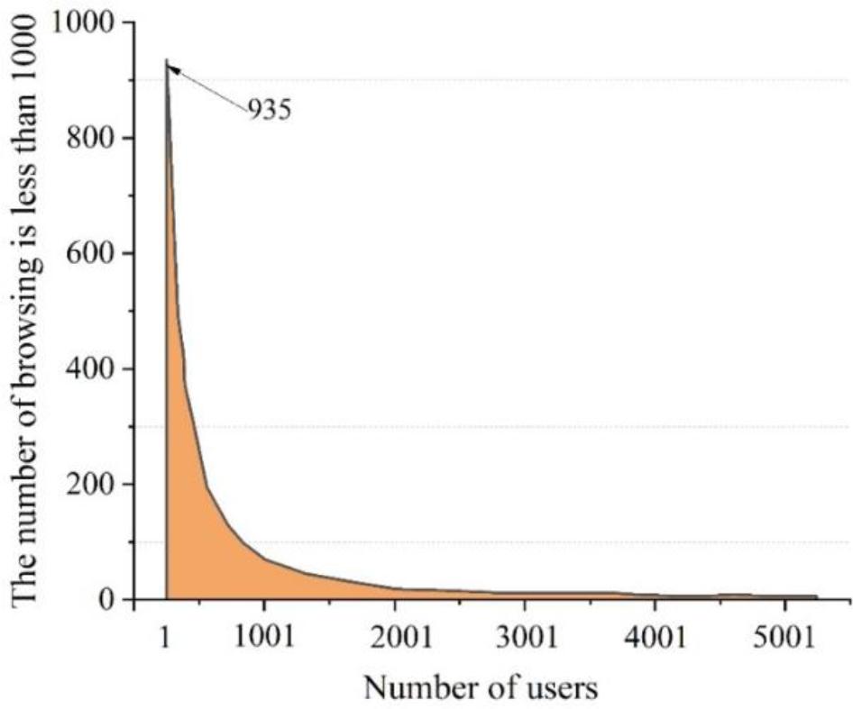The statistics of English learners for course page views of less than 1000 are shown in Figure 4. It can be obtained that the group of people with less than 1000 course pageviews occupies 97.7% of the total number of people, and the total number of pageviews in a semester is 24276, with the average number, of course, pageviews being 48. Among them, the number of course page views within 200 times in a semester of this population occupies about 94.1%.