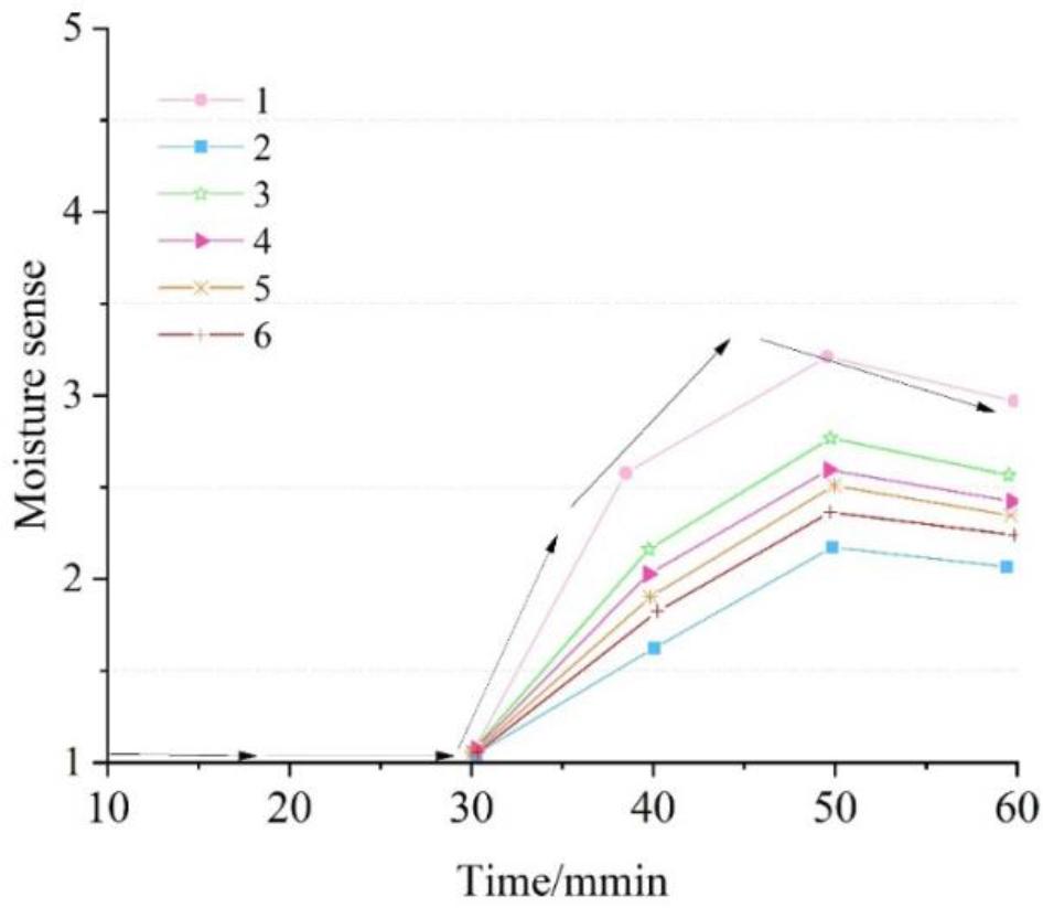 When the temperature difference between the inner surface of the garment and the human skin temperature is too large, the human body will feel a sense of cold and warmth when much sweat exists between the clothes and the garment to see and is not discharged in a timely manner, the human body will feel the sense of wetness and stickiness, and when the humidity of the air inside the garment is very high, the human body will feel a strong sense of stuffiness. The subjective feeling change curves of the test subjects wearing the 6 garments at each stage are shown in Fig. 2, Fig. 3 and Fig. 4.