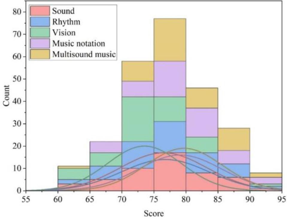 As can be seen from the table, before the experiment, the experimental group and the control group in the five evaluation indexes of sight-singing score level difference is relatively small, such as in the pitch, the average score of the two classes of students was, respectively, 65.15, 66.03, the p-value of 0.195, greater than 0.05, there is no significant difference. After the experiment, the scoring ability of the evaluation indexes of the two classes showed a large gap. The average scores of the experimental class in intonation, rhythm, sight-singing ability, music notation, and polyphonic music perception ability increased by 7.72, 6.37, 7.82, 6.92, and 8.16 points respectively compared with the control class, with a P-value of less than 0.05, which indicates that the smart classroom has a significant promotion effect on students’ ability of sight-singing.