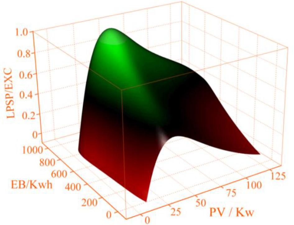 Where the initial SOC of the battery is set = 0.4, the battery undergoes complete charging and discharging once a day and operates for 365 days per year, resulting in a 3D spatial diagram of the configuration of energy storage and PV under known loads as shown in Fig. 3. From the figure, it can be seen that the load shortage rate σ