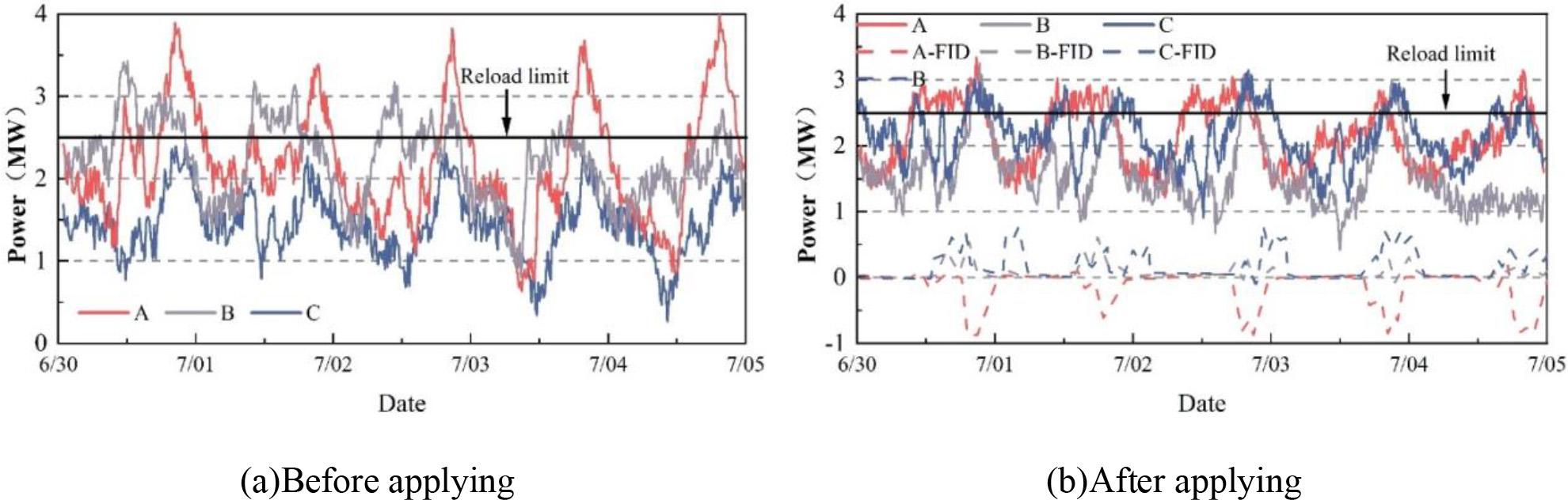 The interconnection project’s application has a comparative effect that is shown in Fig. 11, with Figs. (a) and (b) showing the effect before and after the application, respectively. From the measured power curve, it can be seen that from June 30 to July 5, under the coordinated control of the flexible interconnection engineering implementation in this paper, the maximum load of the three lines can be controlled by 2.5 MW, cutting down the load spikes by 20%, and the FIDs of the three lines are all in the range of -1~1, and the heavy loads of the 10 kV south line (A) and spring line (B) are effectively alleviated to ensure the safe operation of the distribution network. It is proved that the flexible interconnection technology can effectively improve the power supply reliability of the lines, can effectively solve the problems of feeder heavy load and PV back-feeding in the distribution network, improve the power supply efficiency of the distribution network, and provide a strong guarantee for the local consumption of a high proportion of distributed new energy.
