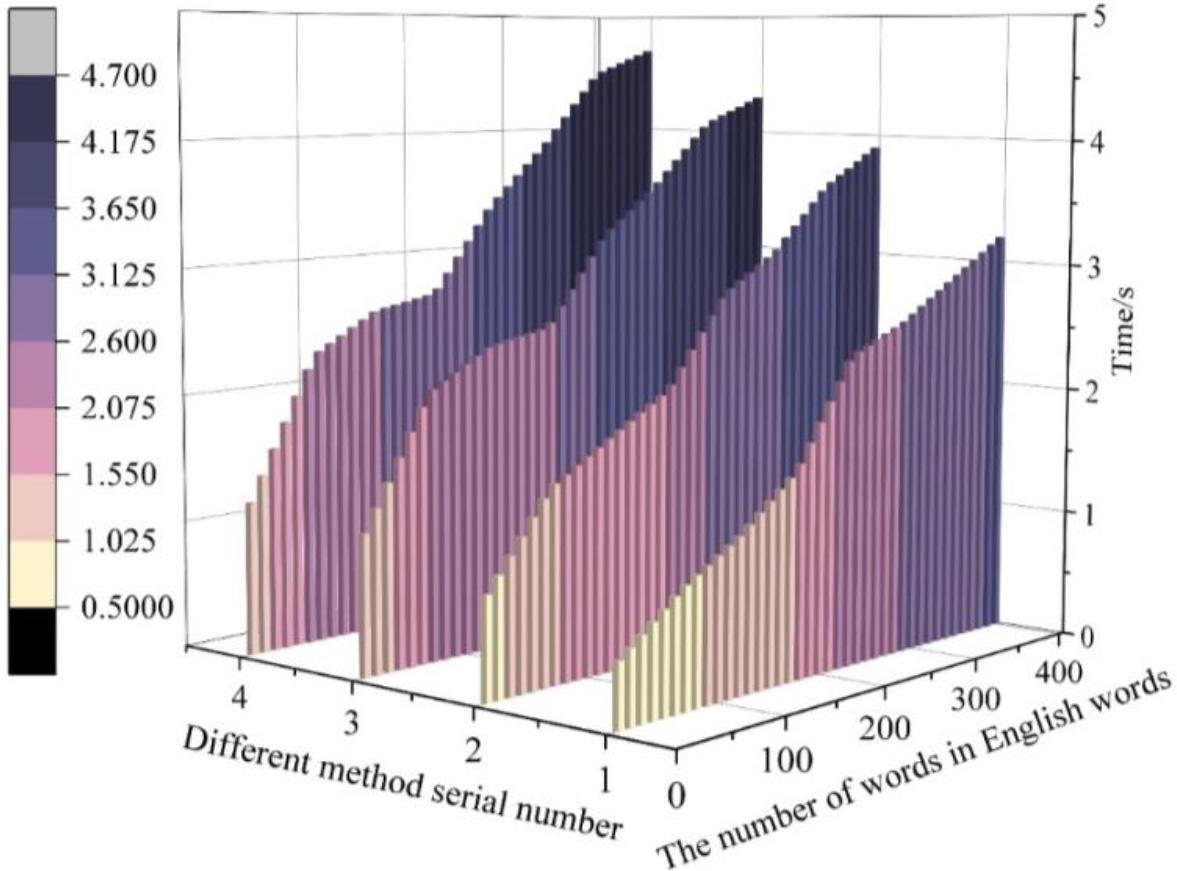 Figure 5 shows the intrusion detection time statistics of the four methods, and the serial numbers 1-4 on the x-axis refer to this paper’s method, the K-means algorithm, the graph neural network-based and the SVM-based intrusion detection methods, respectively. Through observation, it can be seen that this paper spends less time on intrusion detection; when the amount of English education text reaches 400, the time spent is 3.25s, which is much lower than the other several detection methods. Thus, it is evident that the algorithm presented in this paper is superior. The rule-matching speed of this paper’s algorithm has a certain improvement in efficiency over other algorithmic detection methods, which indicates that the proposed algorithm is successful and will be helpful for the future development of intrusion detection methods.