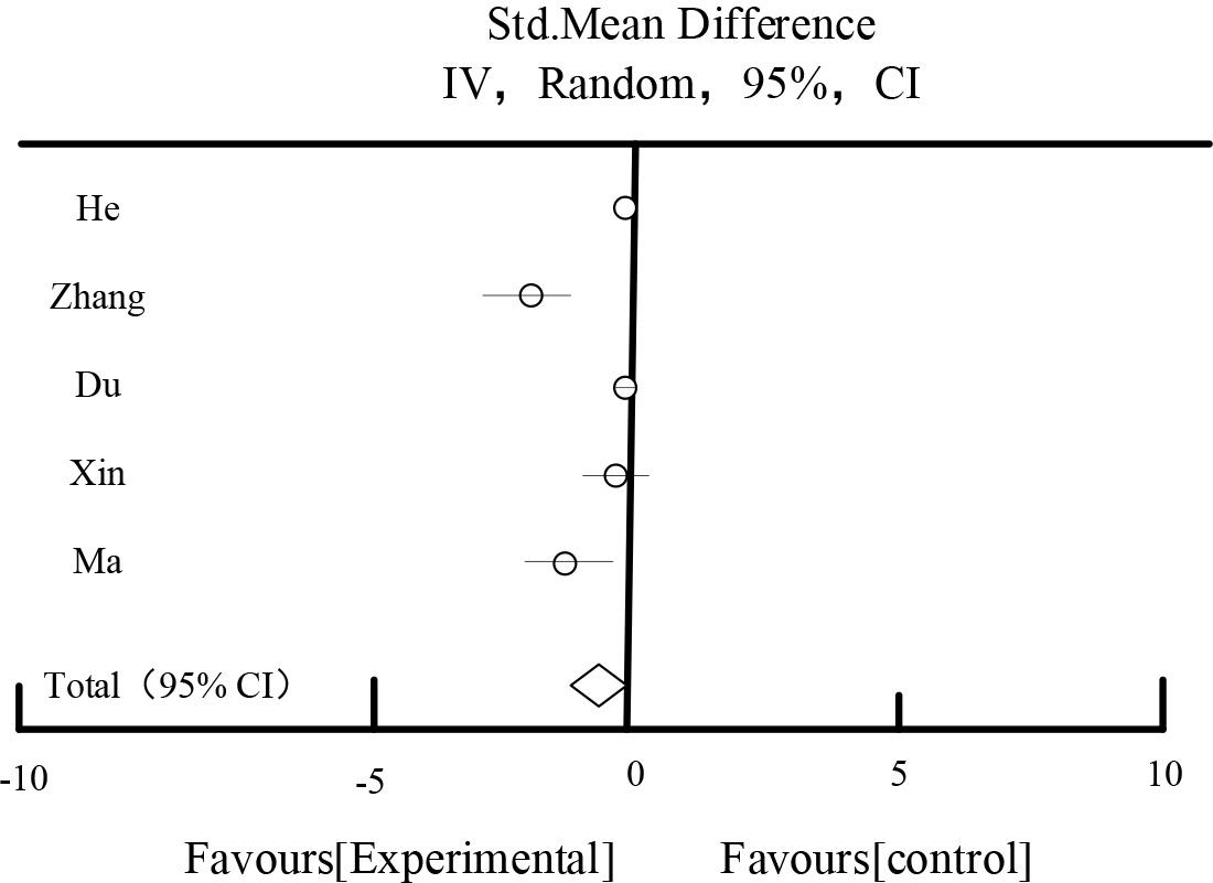 Table 5 and Figure 5 show the results of the effect of 2hPG.A total of 5 studies described 2 hours postprandial glucose, and a total of 754 patients were included. The combined results showed that: there was a large heterogeneity among the studies(I2=82%). After the sensitivity analysis by excluding each study one by one, and different subgroups of analysis targeting the study’s intervention period, drug dosage form, and evidence, the source of heterogeneity still couldn’t be found. A random effect model, MD=-0.58, 95%CI [-0.89,-0.15], P=0.01<0.05, P=0.01<0.15, was used for the study. Random effect model, MD= -0.58, 95%CI [-0.89,-0.15], P=0.01<0.05, the difference was statistically significant, which indicated that the trial group was better than the control group in improving the 2-hour postprandial blood glucose.