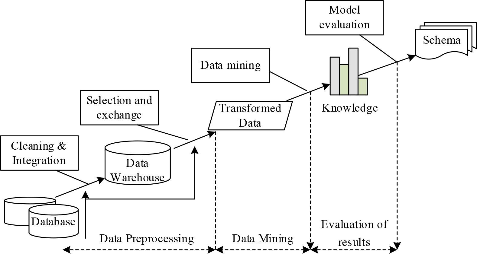 Generally speaking, the process of data mining includes three stages: data preprocessing, data mining, and result evaluation. The data mining process is shown in Figure 1. Data pre-processing stage As the data stored in the database of the computer system has problems such as noise, missing data, and redundancies, it is not suitable for direct data analysis and mining. Therefore, the need for further preprocessing of raw data, and the quality of preprocessing directly affects the quality of data mining results. The data preprocessing stage requires data cleaning, integration, generalization, and transformation, and the final preprocessed data should have the characteristics of accuracy, completeness, and consistency. Data mining stage The data mining stage is the key stage of the entire data mining process, which aims to mine and analyze data after preprocessing. [22] In this stage, it is important to clarify the mining task and select the mining algorithm. It should be combined with the user’s needs to clarify the mining task, and after determining the task requirements, then use the data characteristics to select the appropriate mining methods, such as clustering, association, classification, etc., and then use the corresponding mining means to mine the preprocessed data, from which the corresponding knowledge and patterns are obtained. Result Evaluation After the previous data mining stage, the corresponding results will be obtained. But whether the mined knowledge is effective or not, it still needs to be analyzed and evaluated to eliminate redundant and irrelevant results and finally obtain useful information. If the information we obtained is not what we require, we must return to the previous stage, adjust the data selection parameters, or even modify the data mining method. Finally, after continuous attempts to obtain meaningful results, it is necessary to further convert the results into a user-friendly presentation.