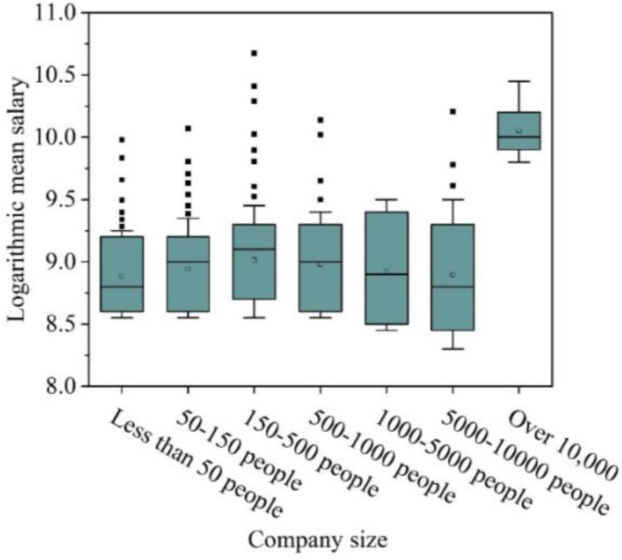 The size of the company is closely related to the economic strength of the company, so the analysis of the size of the company will also help the data tourism industry talents to find jobs with better employment prospects. The box plot of salary versus company size is shown in Figure 5. The larger the company size, the higher the corresponding logarithmic average salary, especially for some foreign-funded and joint ventures. This is also releasing a signal to the tourism industry talents, in the process of choosing a career to learn more about the size and culture of the company, as a prerequisite to screen out the employment opportunities offered by quality companies. Small and medium-sized companies data more demand for tourism industry talents, while the demand of large companies with more than 5,000 employees is less. This practical conclusion may not be in line with the theoretical assumptions, but it does provoke in-depth thinking. Although on the surface of the small and mediumsized enterprises for the tourism industry talent to provide more employment opportunities, but whether it reflects the current tourism industry-related companies are mostly small and medium-sized enterprises in the initial development stage, large enterprises due to their own structural characteristics, all kinds of talent reserves are more complete, but on the contrary, the demand for tourism industry talent is less than small and medium-sized enterprises.