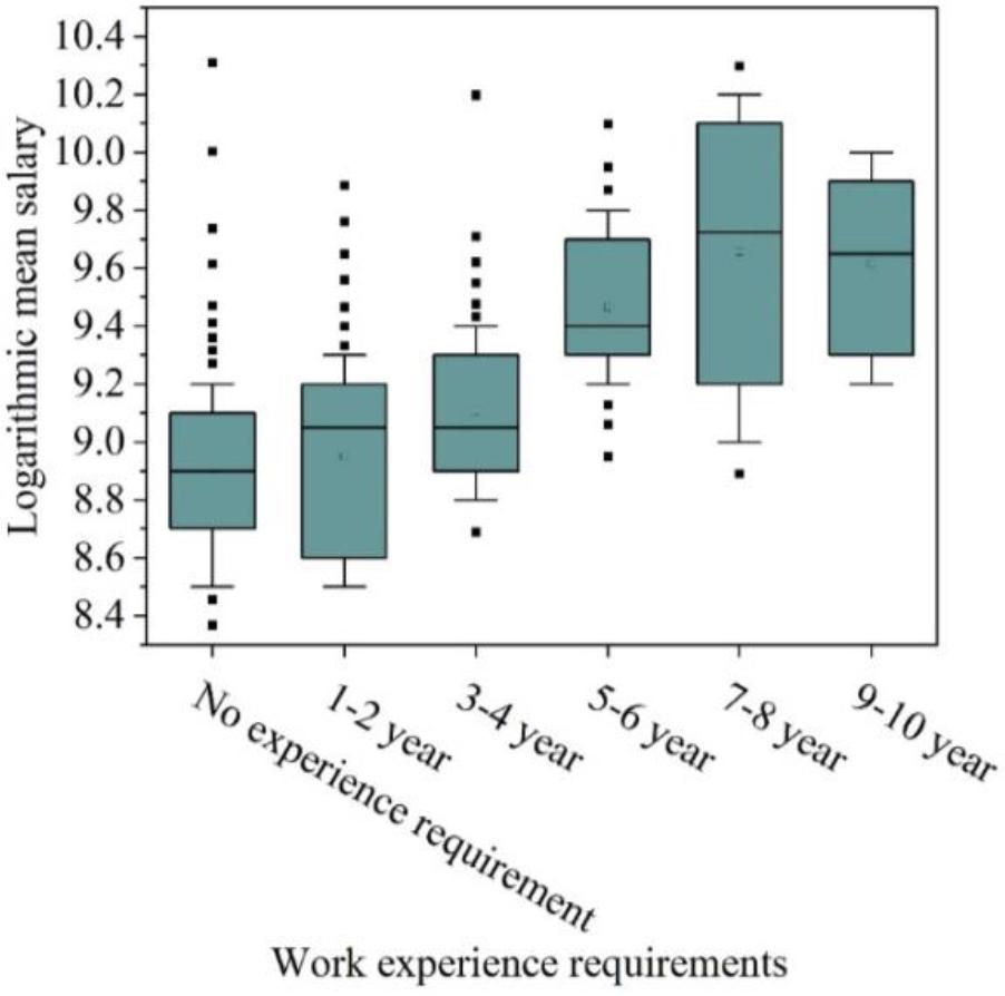 The accumulation of work experience is still particularly important for those who work in the field of tourism industry, and work experience should be accumulated at least to a certain stage in order to have a more complete and independent working mind. The box plot of average salary versus work experience is shown in Figure 6. As a rule, the salary promised by employers increases with the number of years of work experience they require. However, since the travel industry does not require too much work experience, the main focus is on 3-4 years or less. There is not much difference in salary levels for those with 2 years of work and below, but there is a significant increase in salary for those with more than 5 years of work experience, and there is no significant increase in salary after the required number of years of work experience reaches 7 years or above.