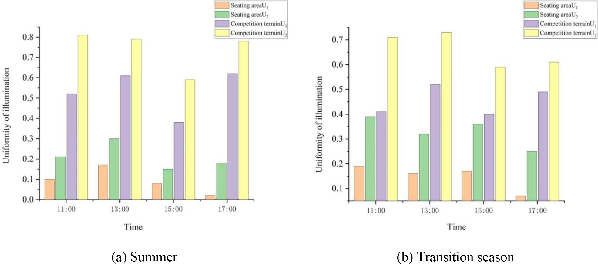 Pavilion has good uniformity of lighting on the playing field. During the summer season, the playing field U1 is between 0.35 and 0.65 and U2 is between 0.55 and 0.85. During the transition season, U1 is between 0.4-0.55 and U2 is between 0.55-0.75. It can basically meet the requirements for lighting uniformity for competition and training. The variation of illumination uniformity is not large and decreases with the increase of illumination value. It reaches its lowest value at 15:00 pm in summer. The uniformity of the sitting area is poor, basically below 0.3.