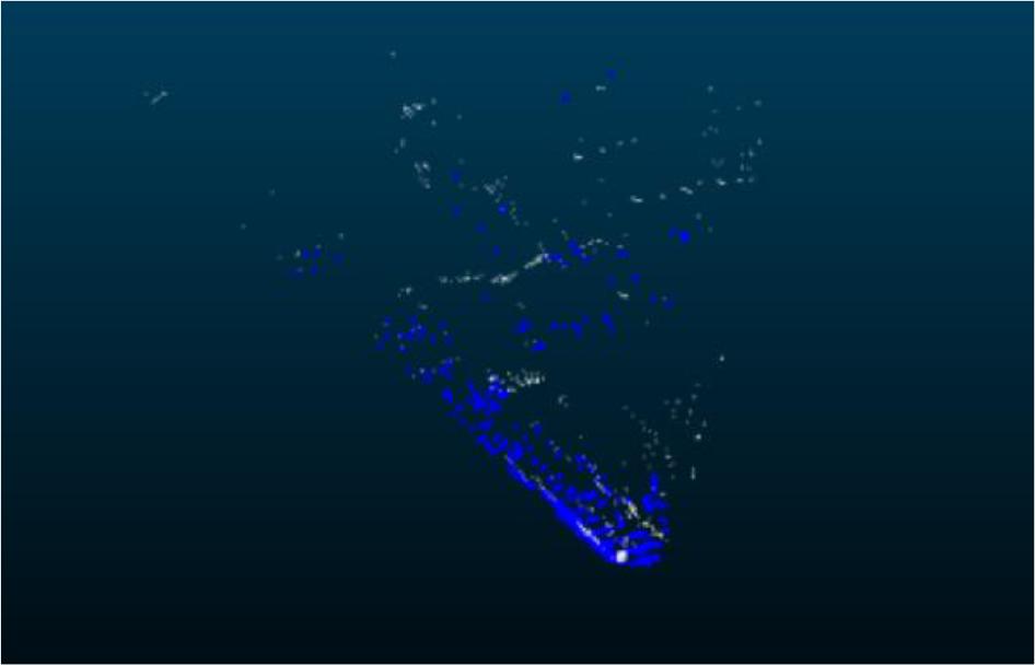 Specifically, after determining that there is frame 1, the spatial position of frame 1 is calculated using the distance measurement principle in personnel positioning. Since the excavator arm is a complete arm, each part of the arm frame will have an overlap area. Therefore, the center point of the overlapped area can be calculated and back-projected into the space using the internal and external parameters to form a straight line back-projected. Then calculate the distance from the points in frames 2 to the straight line and take the minimum value. If the minimum value is within the set threshold range, the frame 2 corresponding to the minimum value is considered to be the matched frame 2. Similarly, the matching frame 0 can be determined using the above method. After determining the appropriate excavator arm frame, the point cloud in the excavator arm frame can be removed to perform straight line fitting of the excavator arm. Taking the above figure as an example, there are three excavator arm frames 012. When performing straight line fitting of the excavator arm, the excavator arm point cloud is first projected to the ground, and then a straight line fitting is performed, because the excavator arm is curved in space and a straight line cannot be directly fitted.