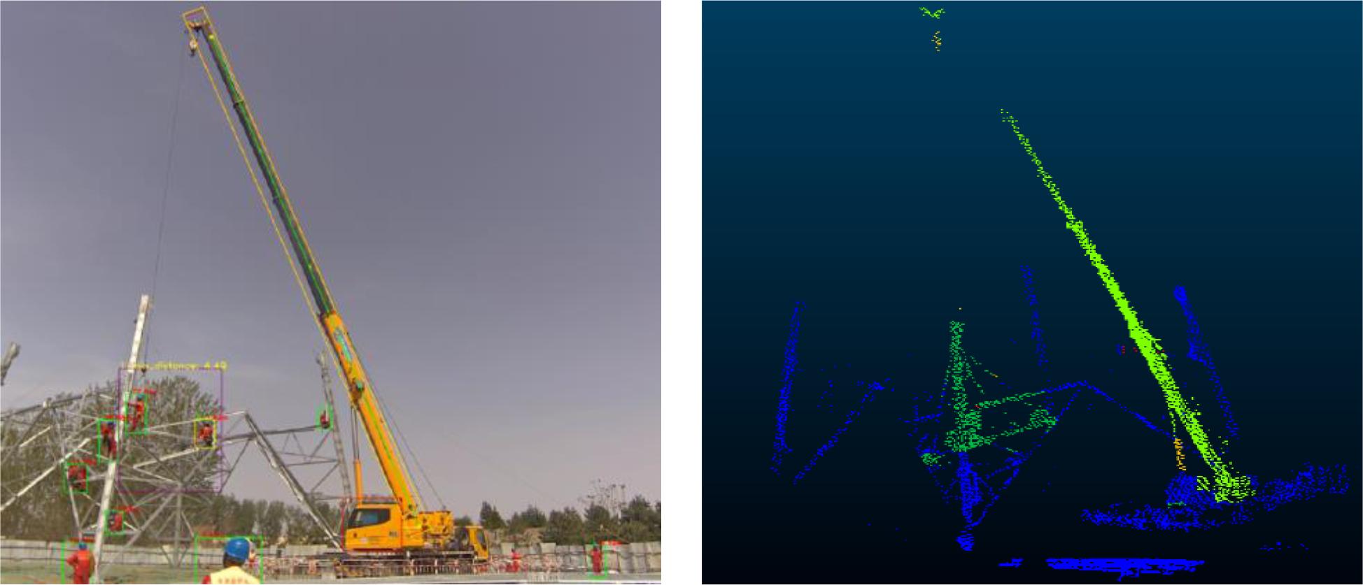 When used on site, the point cloud within 20 meters around the center of the boom is sent to the point cloud segmentation model to segment the point cloud of the hanging object. After obtaining the point cloud of the hanging object, the subsequent behavior identification of people standing under the hanging object, people standing on the hanging object, and people holding the hanging object can be completed. When the hanging object is raised, for the behavior of people standing under the hanging object, the longest distance from the center of the hanging object point cloud to the vertex of the external frame is projected to the ground, and the projection of the center of the hanging object point cloud on the ground is taken as the center of the circle. If the projection of the person on the ground is within the circle and the height of the person is less than the height of the lowest point of the hanging object, it is considered that the person has stood under the hanging object; when the projection of the person on the ground is within the circle and the height of the person is greater than the height of the lowest point of the hanging object, it is considered that the person has stood on the hanging object; when the person is less than 0.5 meters away from the hanging object in space, the person is too close to the hanging object and it is considered that there is a risk of holding the hanging object by hand.