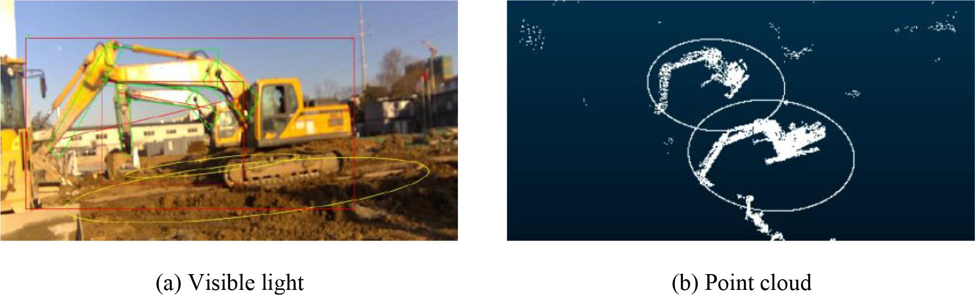 As shown in Figure 7, when performing arm detection, the excavator is first detected in the whole picture, and then the arm detection is performed in the detected excavator. The entire arm is divided into three parts, the base part corresponds to frame 0, the middle part is frame 1, and the part close to the bucket is frame 2. As can be seen from the figure, the arm detection does not necessarily detect the three frames 012 accurately. Due to reasons such as viewing angle or occlusion, there may be more or less than three frames. Therefore, it is necessary to align the arm frames to obtain frames on the same arm. First, determine whether frame 1 exists. If frame 1 exists, and there is frame 0 or frame 2, or both, continue making subsequent judgments. Two frames 2 are detected in this scene, but only frame 2 on the left and frame 01 constitute a complete arm. Therefore, it is necessary to screen the two frames 2 to find the frame 2 that matches frame 01. In this project, 2D sequence rotation frames are used and combined with 3D point cloud information to complete the matching of the arm.
