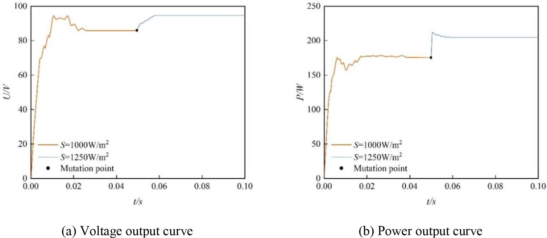 The control algorithm of the perturbation observation method is relatively simple, and the tracking effect is also relatively good, which is not affected by the parameters of the electrical characteristics of the PV cell, so it is widely used in practice. The perturbation observation method’s tracking curves under different sunlight intensities are depicted in Fig. 6, where Fig. (a) is the voltage output curve and Fig. (b) is the power curve. In Fig. 6, when the sunlight intensity is 1000W/m2, the voltage is close to 85V, and the power is close to 175W after the waveform is stabilized, and the voltage is close to 95V, and the power is close to 205W when the waveform is stabilized after the sunlight intensity is abruptly changed to 1250W/m2.