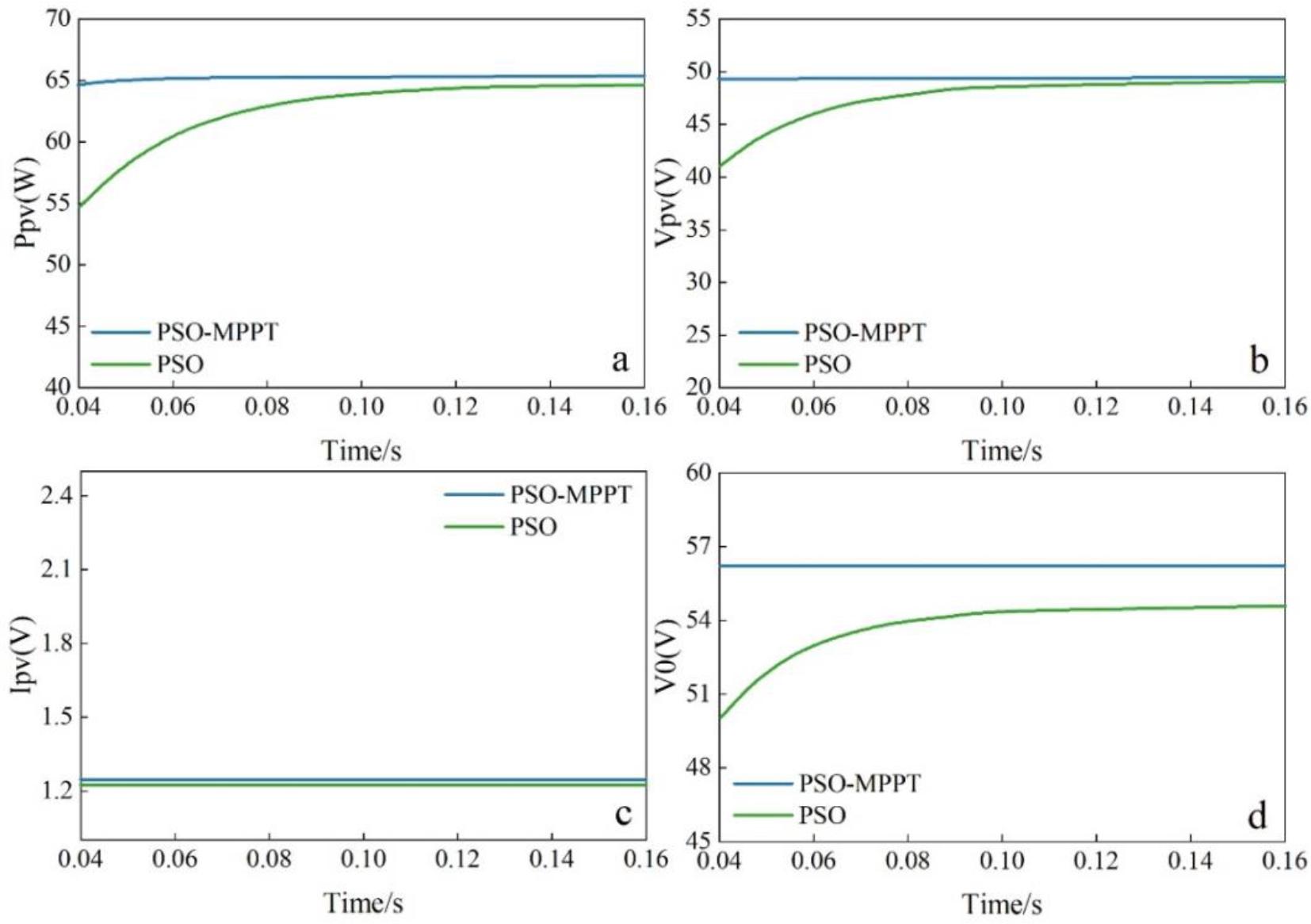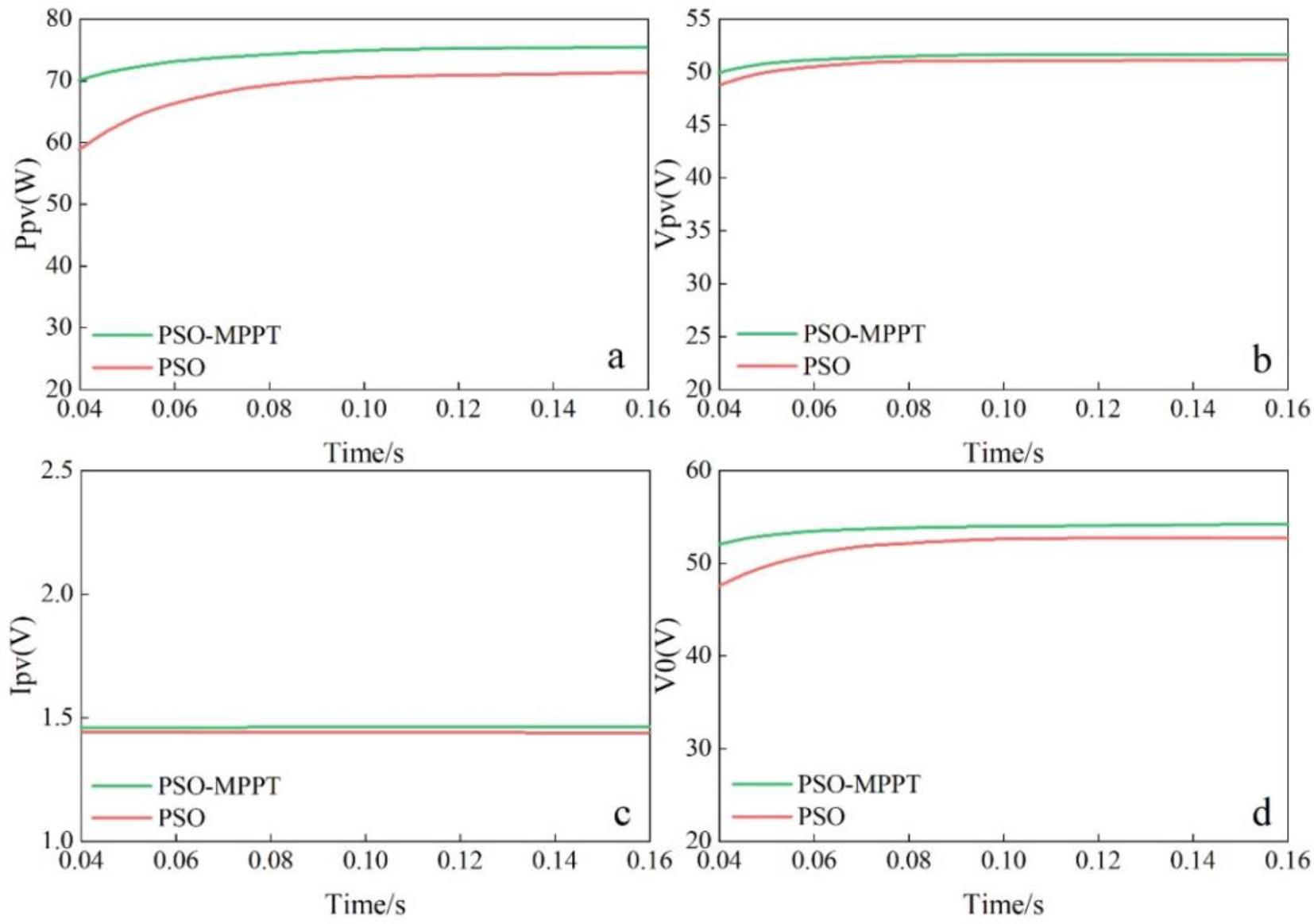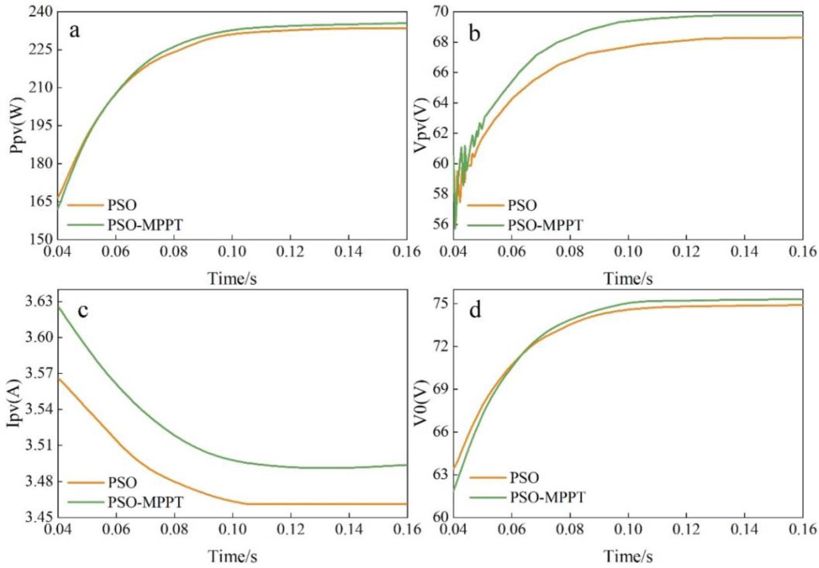 The GMPP is identified by the proposed MPPT to verify the effect of partial shadowing. To track GMPP, Vpv and Ipv are crucial for identifying the MPP. The actual PV power (Ppv), PV voltage (Vpv), PV current (Ipv) and output voltage of the boost converter (V0) are given based on the results of PSO and the proposed PSO-MPPT algorithm. The simulation results are performed in the same mode and at a temperature of 25°C as in Case 1. The maximum power of the PVS in the four modes is 235.74 W, 115.86 W, 78.64 W, and 65.42 W, respectively, at a temperature of 25°C. The performance of the PV system in mode 1 of the PSO and PSO-MPPT algorithms is shown in Fig. 10, with (a) to (d) showing the actual PV power, PV voltage, PV current, and boost converter voltage, respectively. Observing Fig. 10, it can be found that the actual extracted power of PSO and PSO-MPPT are 232.15W and 235.22W, respectively, and the PSO-MPPT technique tracks the MPP (Maximum Power Point) of the system better than PSO.