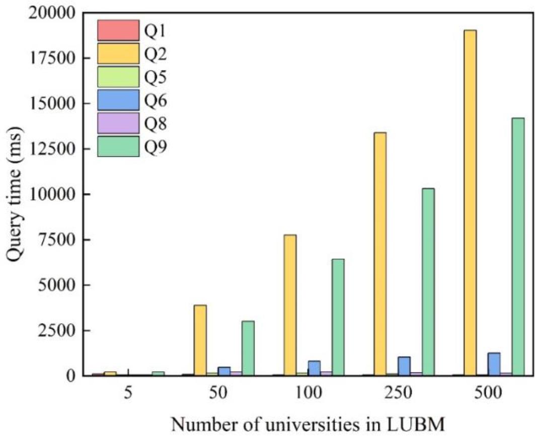 The 10 queries of LUBM were divided into two groups with different categories. The first group includes queries 1, 3, 4, 5, 7, 8, and 10. These queries are highly selective and return fewer result data, and thus are labelled as fast queries. Correspondingly, the second group of queries includes queries 2, 6, and 9, which return more results or have more complex queries, are slower to execute and are labelled as slow queries.