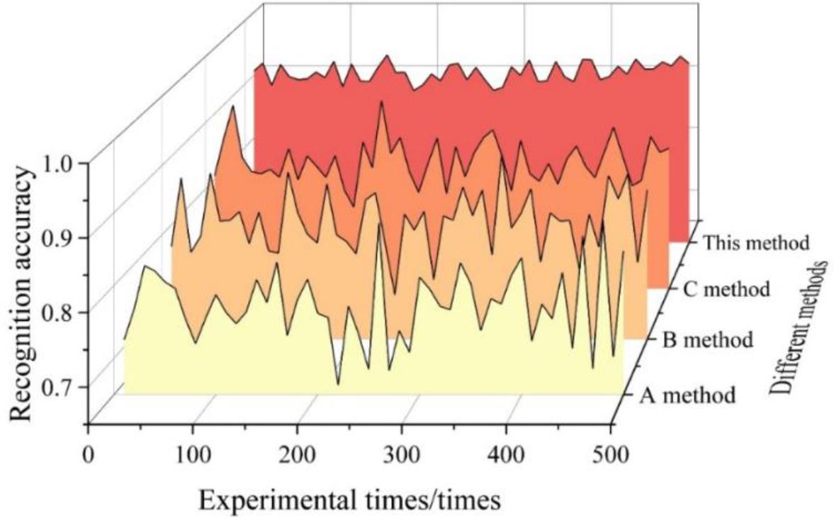 Taking the signal sequence of Fig. 2 as the research object, the designed method is compared with A system recognition based on sound signal, B recognition based on LM-BP neural network, and C system recognition method based on HMM to test the accuracy of different methods for speech recognition, and the comparison results are shown in Fig. 3.
