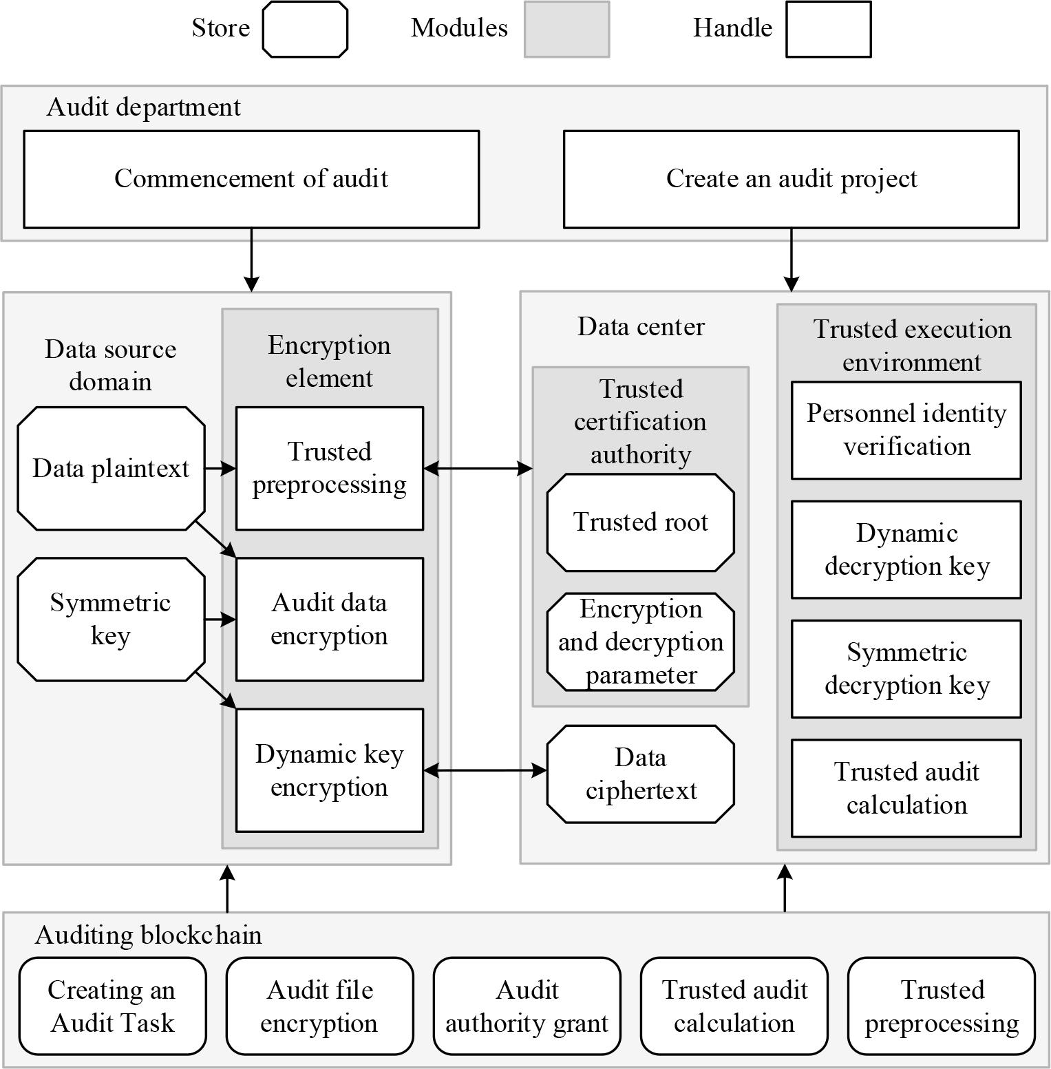 The data sharing and interest protection system’s architecture is depicted in Figure 2. The auditing blockchain deploys smart contracts for the controlled flow of auditing data to achieve the functions of smart contract execution, uploading of deposited data to the chain, and querying and verification of information on the chain. Uploading audit behavior to the chain for certification is the basic guarantee for security review, and the realization of the blockchain’s certification of data operations, access records, etc. facilitates the tracing of responsibility and auditing after the fact. Internal and external network isolation technology is used by the data source end to ensure data security within each business department and create a secure and trustworthy data transmission channel. The data encryption component ensures that the audit data is transmitted in the form of cipher text to the external world. At the same time, it uses trusted root verification technology to ensure the chained credibility of data and prevent data from being tampered with during transmission. The data middle station summarizes the power data transmitted by each business department and stores the ciphertext of the audit data processed by the encryption component. It provides data upload, download, and storage services for internal personnel. The trusted execution environment is a secure development environment protected by hardware mechanisms with built-in API interfaces for key management, cryptographic algorithms, and so on. Auditors can conduct black-box audits in the trusted execution environment to protect the confidentiality of audit data.