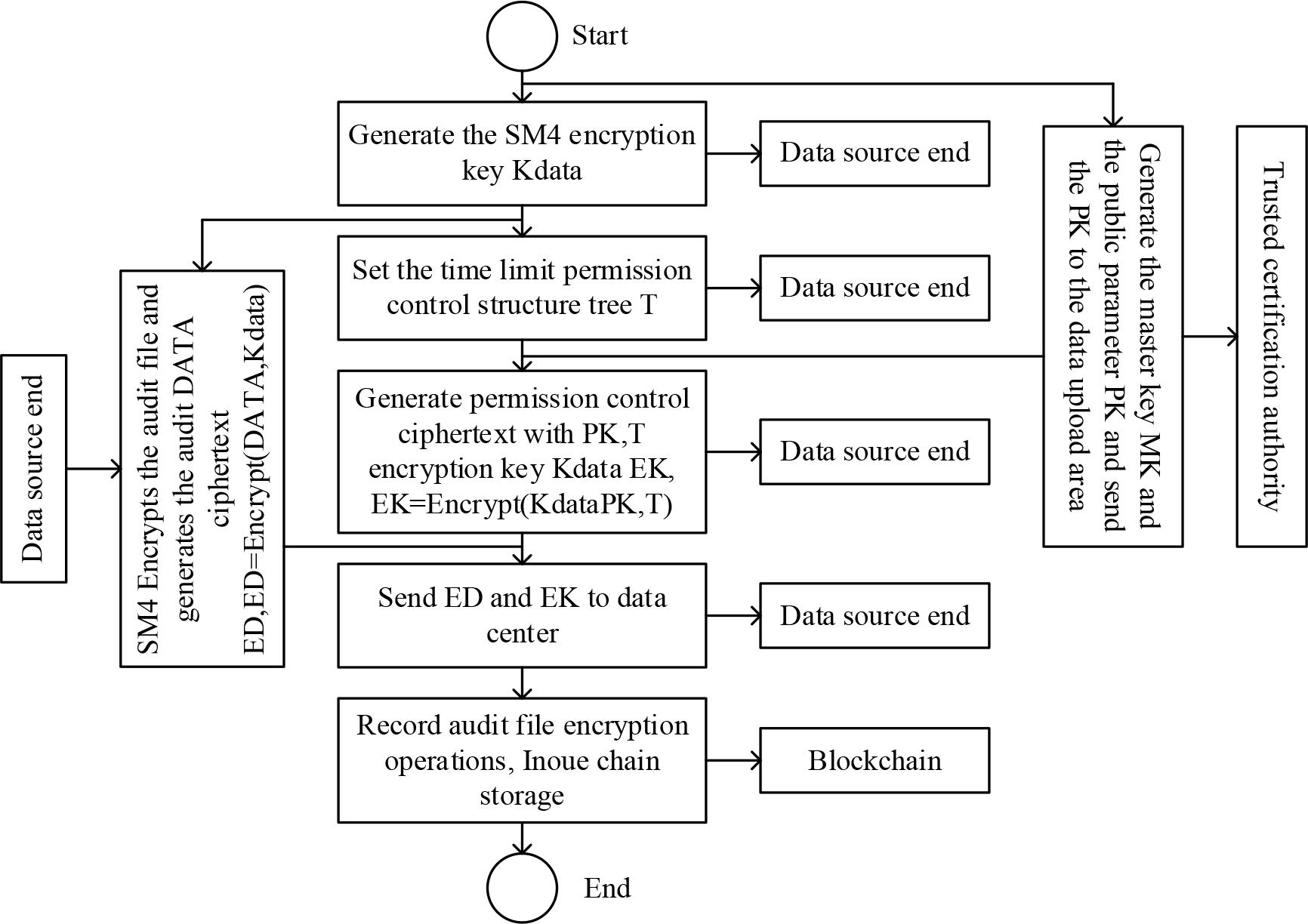 Trusted Preprocessing Whenever a batch of new business data is generated at the data source, it needs to be encrypted and uploaded to the data source for safe storage on a regular basis. Firstly, trusted preprocessing of business data is carried out to generate the secondary trusted root of the business data, which is used for subsequent verification of the consistency and integrity of the business data. Audit file encryption The audit team leader creates an online audit task, specifies the auditor, audit file, audit time and other information, generates the access control policy for the audit file according to the audit task requirements, and encrypts the audit file by combining cryptography technology. The shared file encryption process is shown in Figure 4. The business department encrypts the audit file using the symmetric key Kdata to get the audit file ciphertext DE; constructs the access control structure tree T with time restriction, encrypts the symmetric key Kdata using the permission structure tree T and the public parameter PK attribute to get the access control ciphertext uploads the audit file ciphertext KE and the access control ciphertext KE to the data middle station for storage. Granting of Auditing Privileges The online auditing platform grants online auditing privileges to designated personnel, and only auditors whose user attributes satisfy the access control structure tree r within the auditing timeframe can decrypt the ciphertext of the auditing file and obtain online auditing privileges for the data. Trusted Audit Determination The auditor verifies the correctness of the received data using the second-level validation root, and performs black-box calculations in the trusted execution environment, uses the built-in audit determination model, performs statistical analysis and processing of the audit data, and exports a report of the audit results.