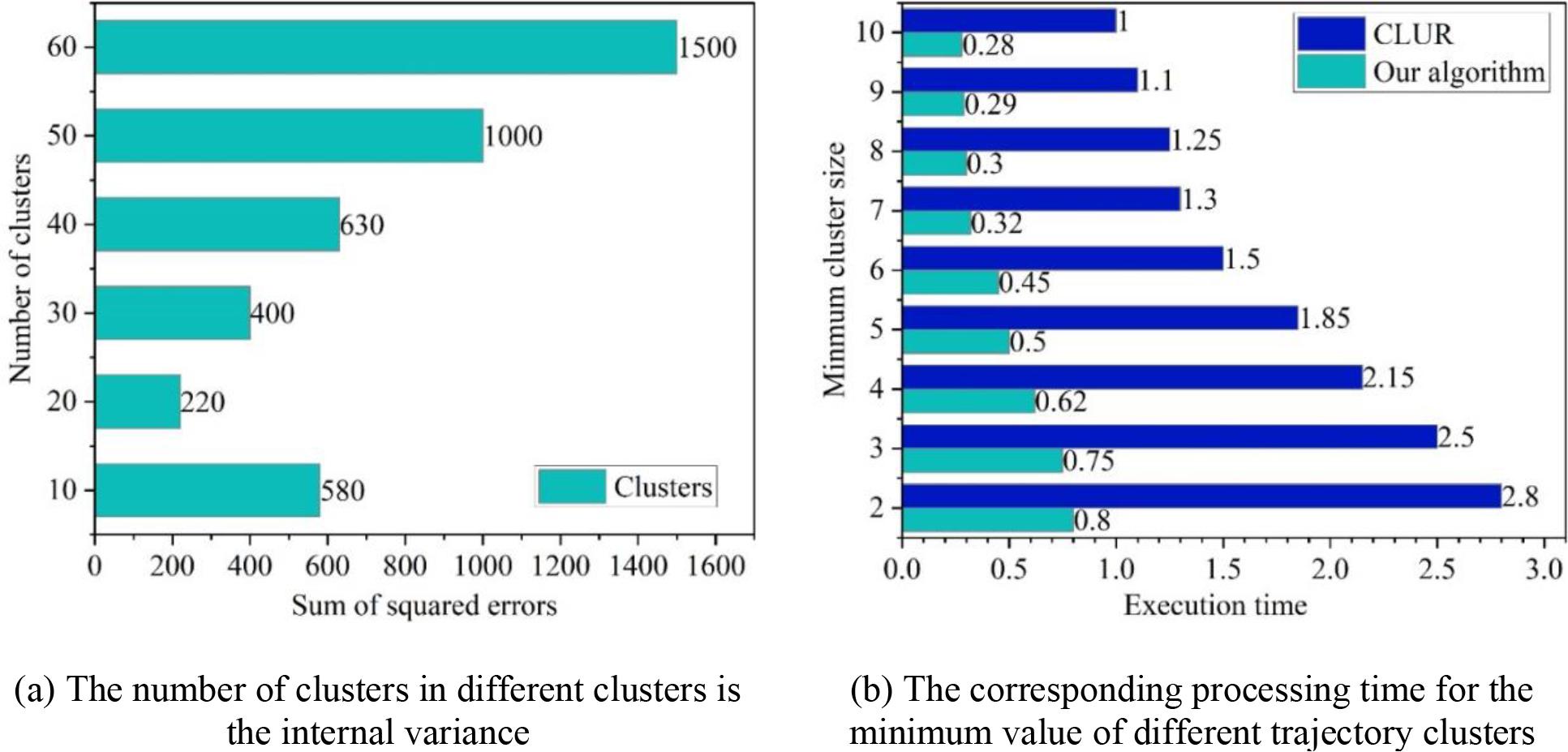 In the parameter sensitivity analysis of the algorithm, the algorithm designed in this paper with the increase of the minimum value of the set trajectory clusters, the time is slightly reduced, and the running time of the algorithm designed in this paper is much smaller than the CLUR algorithm compared to the algorithm, which indicates that the algorithm of this paper for the parameter of the sensitivity of the parameter is lower than the CLUR algorithm.
