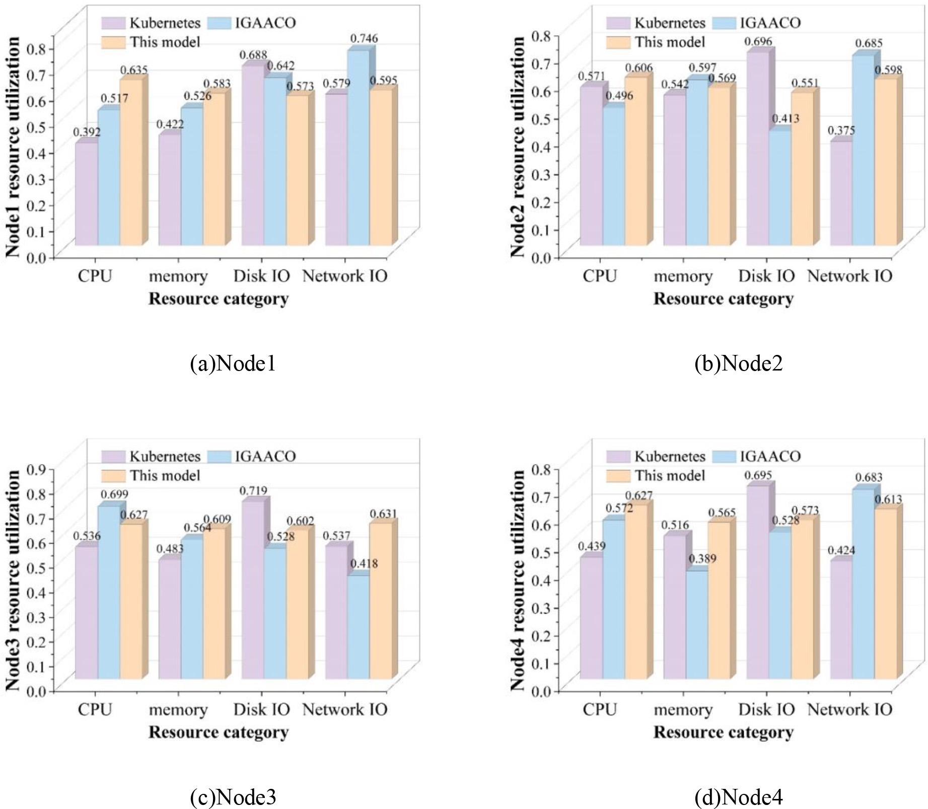 In this resource scheduling experiment, the monitoring module designed in this paper is used to monitor the utilization of various types of resources and scheduling time of the deployed Node working nodes, and a comparison of the utilization rates of various types of resources of the Node is shown in Fig. 4. Where (a) to (d) are Node1, Node2, Node3 and Node4 nodes respectively.