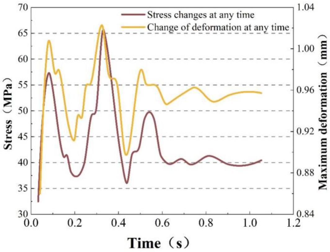 According to the results of kinematic analysis, the kinematic parameters of the pre-assembled substation box transport vehicle can be obtained when passing through the speed bump. In the finite element structural analysis, the maximum vertical acceleration value generated by the speed of 20km/h is taken as the input of the analysis condition, and the change of the situation of the pre-assembled substation box during transportation is shown in Fig. 6. The maximum stresses in the pre-assembled substation box are located at the top and bottom of the box. This is due to the fact that during transport, the pre-assembled substation box is often subjected to various external impact and vibration forces, which results in the appearance of stresses at the top and bottom. The stresses generated at different times are different, and the maximum stress occurs at 0.33 s, with a value of 66.53 MPa. The top is less stressful compared to the bottom, and there is no obvious part of the main structure with larger stresses, which indicates that the transport of the box body through the process of the speed bumps has a smaller impact on the structural stability of the box body equipment. Meanwhile, the top and bottom are the main locations where the pre-assembled substation box experiences the most deformation. The maximum deformation size of 1.017mm, the top relative to the bottom, the deformation is smaller, and the main structure does not have a significant deformation, further proving that the optimised box transport through the speed bumps in this paper on the deformation of the structure of the equipment has a smaller impact, which illustrates that this paper’s optimised design of the pre-assembled substation can effectively ensure the stability of the structure of the internal equipment in the transport process.