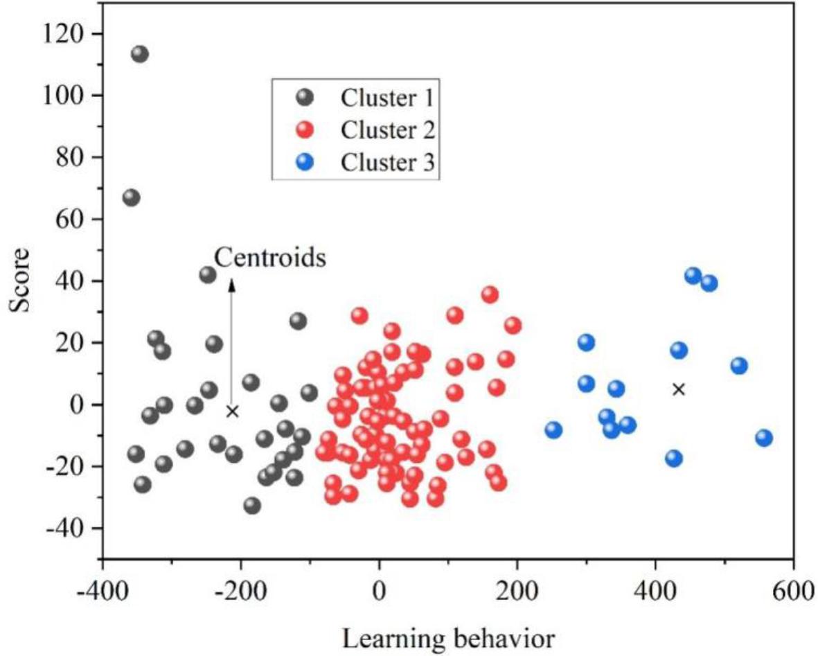 The online learning behavior data was clustered using K-means method. And the distribution of clusters is shown in Figure 3. We can analyze: