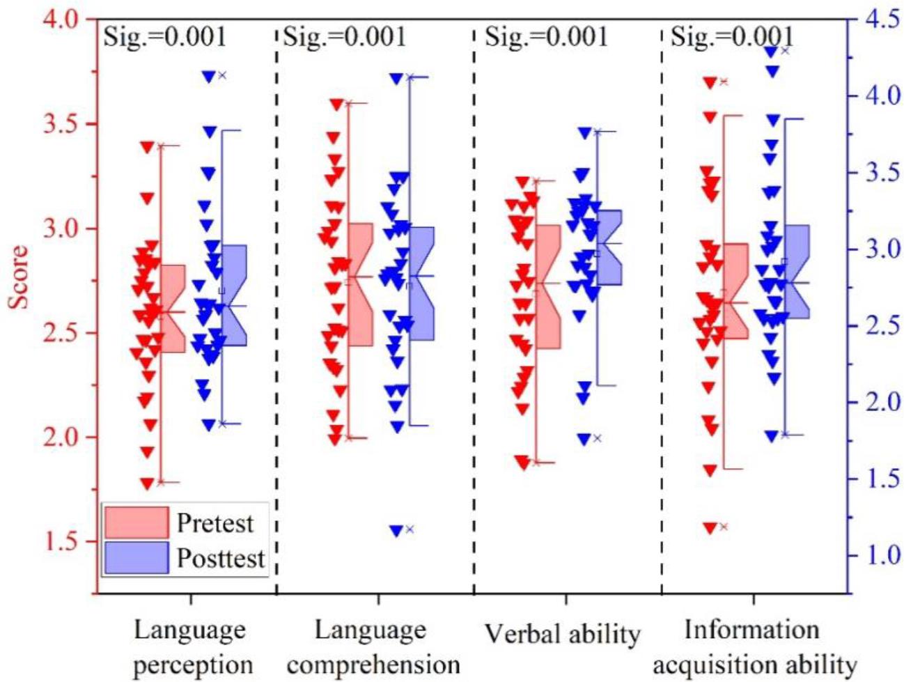 In the intelligent interactive teaching experiment carried out in this study, SPSS software was used to statistically organize the pre- and post-test questionnaire data of the students in the experimental class, and then a paired-sample t-test was done to obtain the test results as shown in Figure 5. Among them, the post-test mean of the language perception ability dimension increased by 0.32 compared with the pre-test mean, indicating that the language perception ability of the students in the experimental class was improved after the experiment compared with the pre-test.