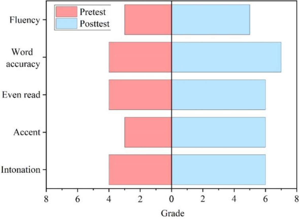 Before the experiment, the students in the experimental class were pre-tested through the English listening and speaking test questions, and after the experiment, the test was conducted again, the content of which was mainly centered on the intonation, stress, legato, word accuracy and fluency of English pronunciation, and the scores were uniformly scored in accordance with the standards of the listening and speaking assessment, and the results of the test are shown in Fig. 6. It can be seen that the students in the experimental class had a significant improvement in the scoring grades of intonation, stress, legato, word accuracy and fluency of English listening after the experiment, and the post-test grades were all more than grade 6, which indicates that the overall level of English listening and speaking of the students in the experimental class had a significant improvement after the experiment.