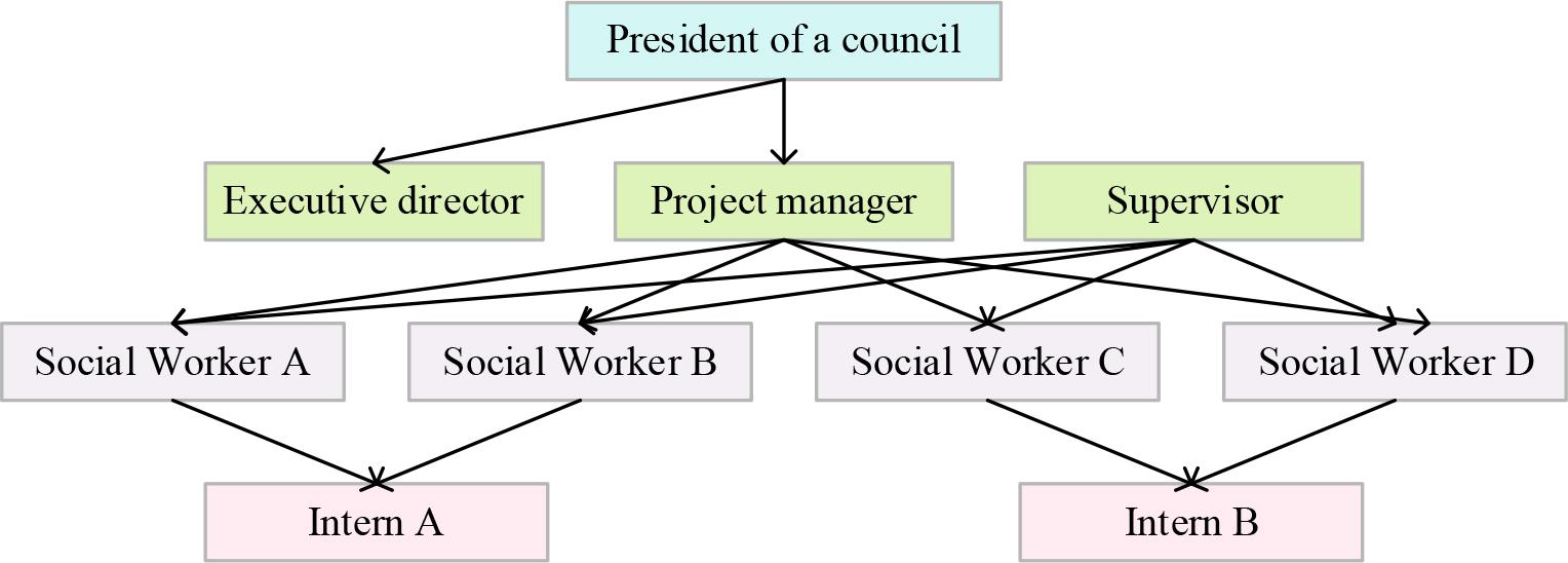The organizational framework of social work agencies is shown in Figure 1. Social work agencies are committed to professional values, theories and skills of social work, serving the needy people in society, adhering to standardized management, project-based operation, participatory innovation, high-performance outputs, and aiming at personal empowerment, community empowerment, and professional enrichment. The scope of the agency’s services mainly includes children’s social work, youth social work, gerontological work, social work for the disabled, and the main source of projects is government-funded services.