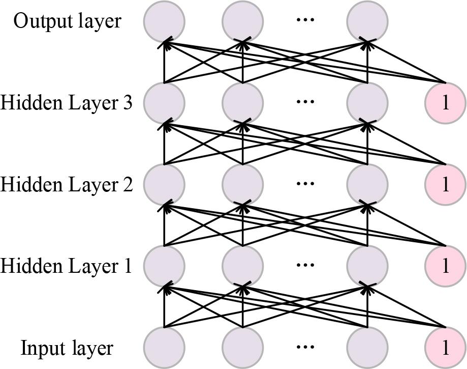 Neural networks, also known as multilayer perceptrons, are one of the most basic neural network structures and the most widely used. A deep neural network (DNN) is a multilayer perceptron containing many (more than two) hidden layers.The DNN deep neural network is shown in Fig. 2 and consists of one input layer, three hidden layers, and one output layer. Here the input layer of the DNN is set as layer 0 and the output layer is set as layer L. The operations of the neural network can be defined as:
