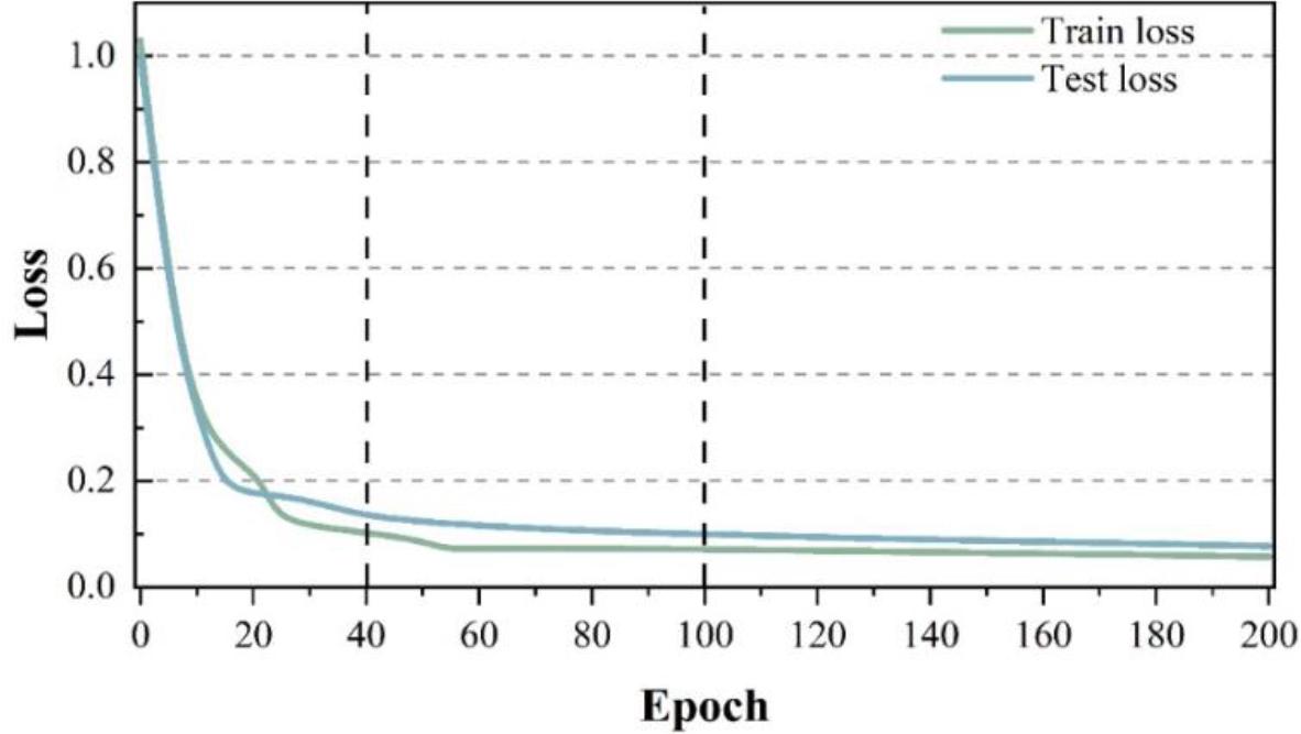 The change of loss curve of DNN risk recognition model built in this paper is shown in Fig. 3, from the change of loss value, we can see that the Train loss curve and Test loss curve, the change trend of the two curves is basically the same, starting from the loss value of about 1 to start a sharp decline, after 40epochs of iteration the curve begins to slow down the decline, and then to the After 100epochs the train loss and test loss curves gradually stabilize, indicating that the network begins to converge, and the training is completed at 200 Epochs, and the loss value drops to 0.1.
