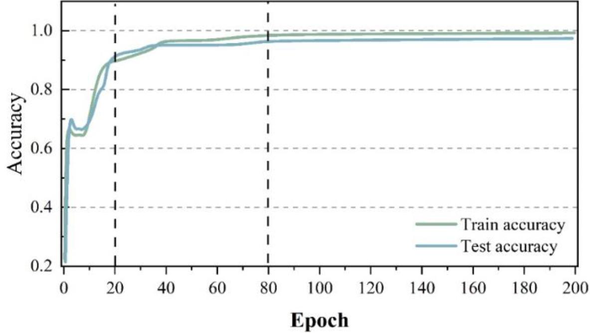 Then the hyperparameters are set, the learning rate is set to 0.001, the number of iterations is set to 200, the number of batches processed each time is set to 50, the cross entropy loss function is selected for the loss function, and the training mode is retraining. After the setup is completed, the GPU is called to train the network, during the training process, we need to pay attention to the loss value (loss) and accuracy (accuracy) of the two parameters change, the loss value decreases to prove that the error is converging, the accuracy value increases to prove that the accuracy rate is increasing, these trends can indicate whether the generated model is ideal or not.